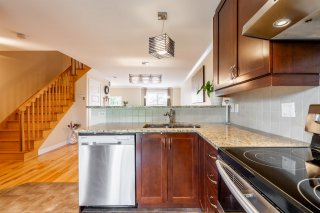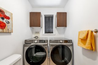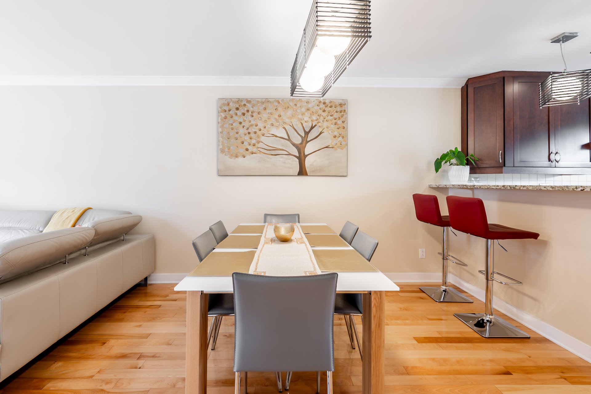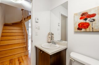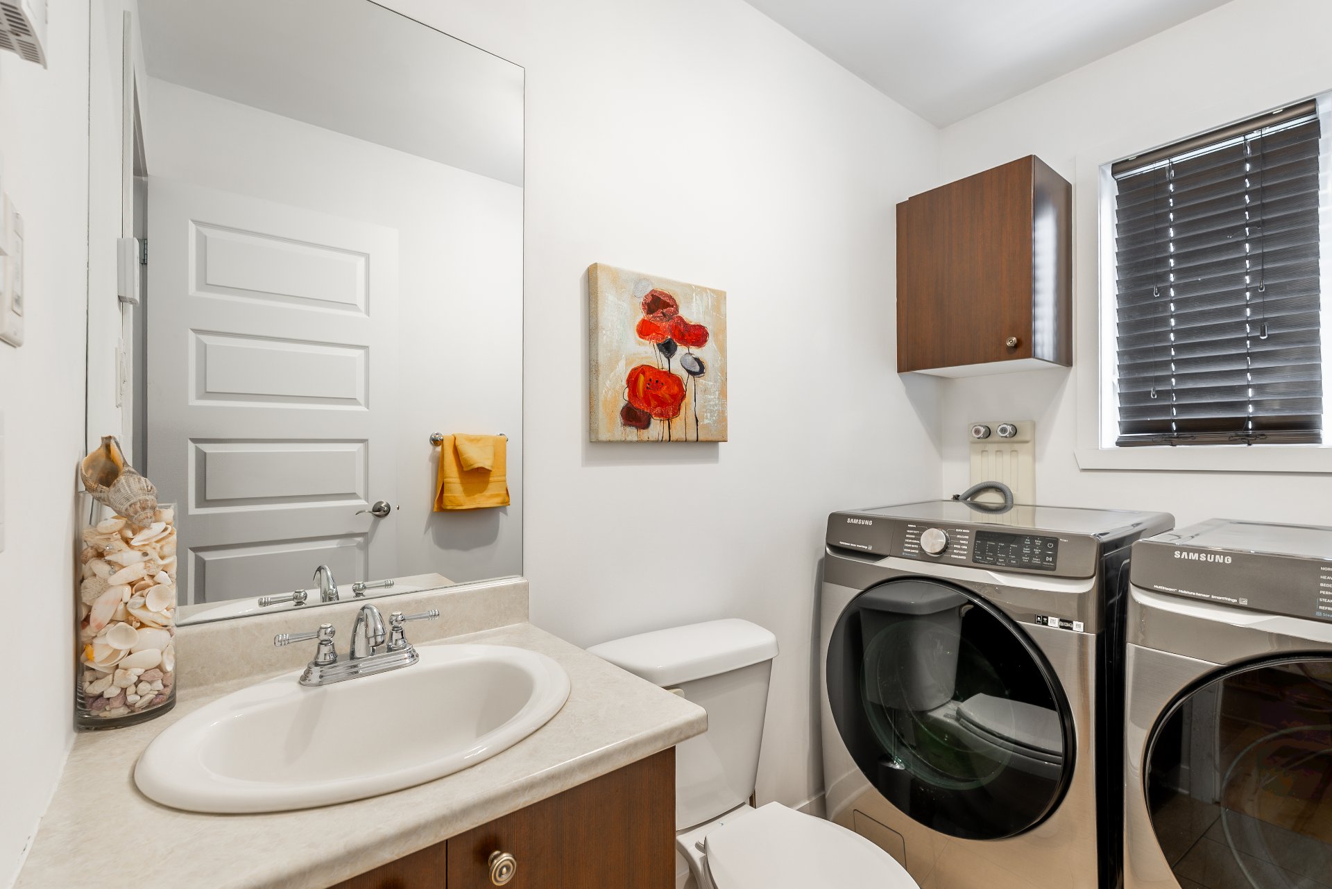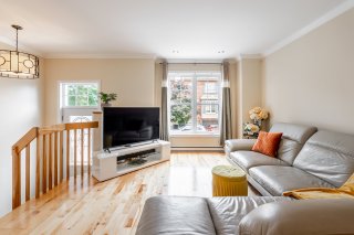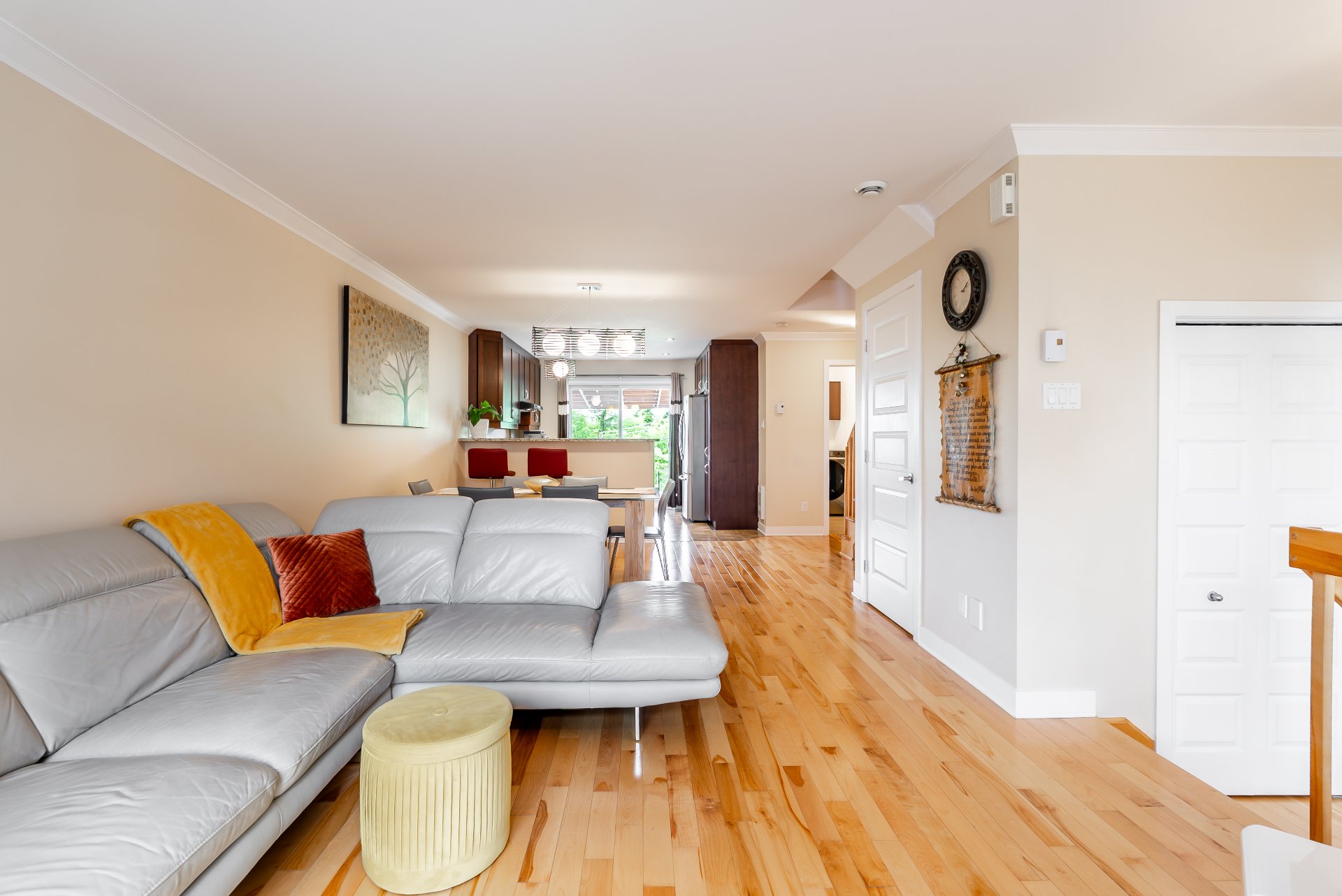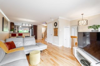 Bathed in natural light, the property welcomes you with an open-concept main floor featuring a warm living room, a modern kitchen with granite countertops and full-height cabinetry, as well as a convenient powder room with laundry area.