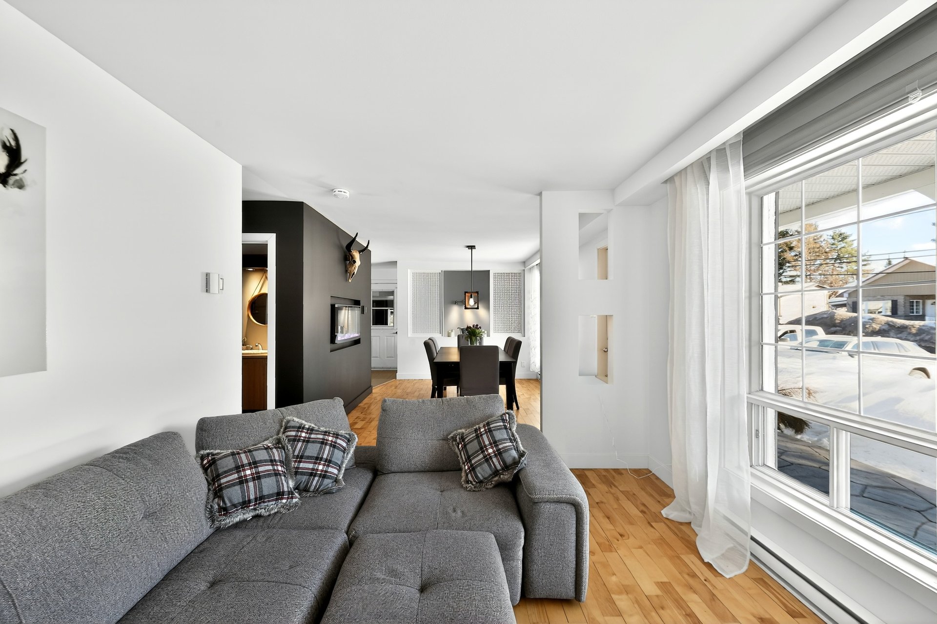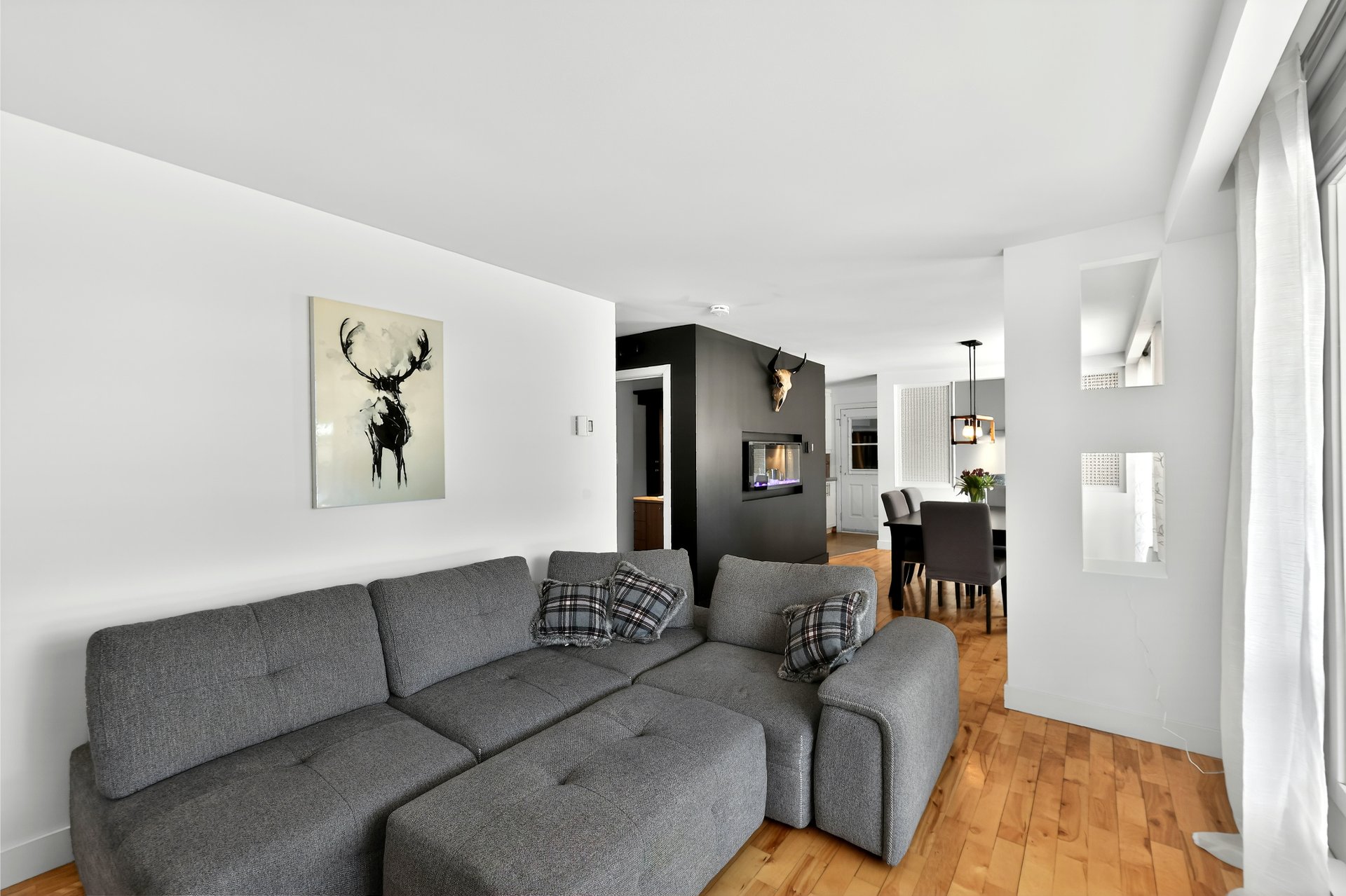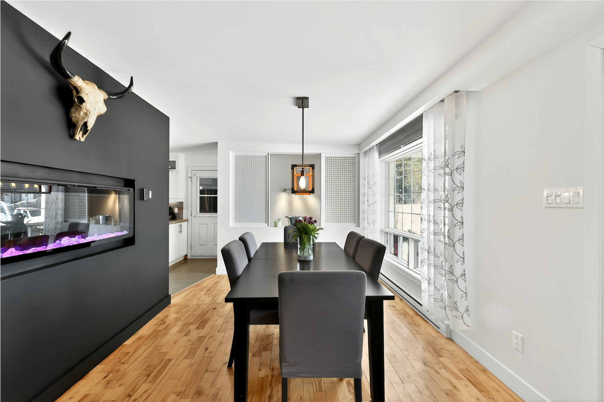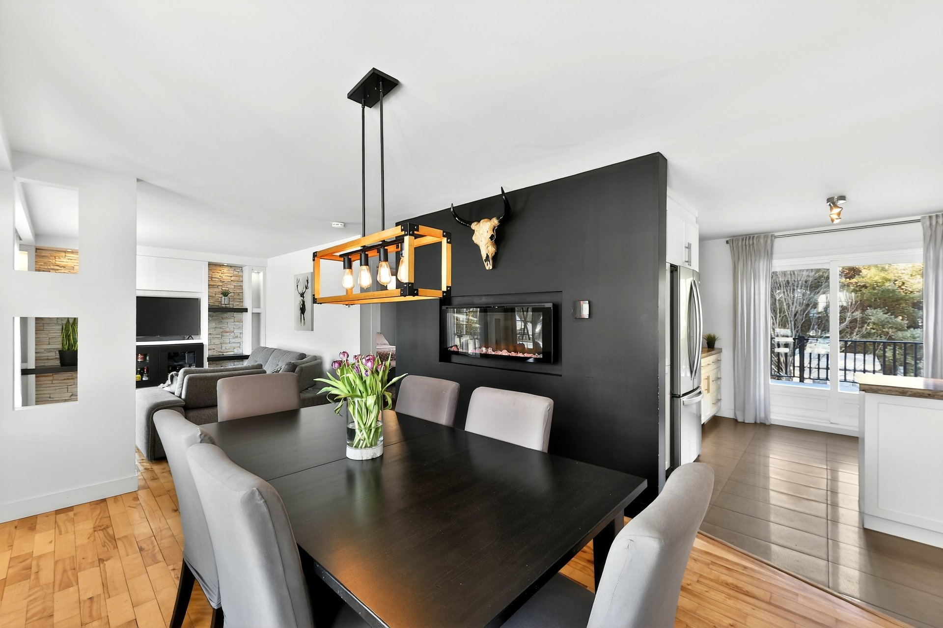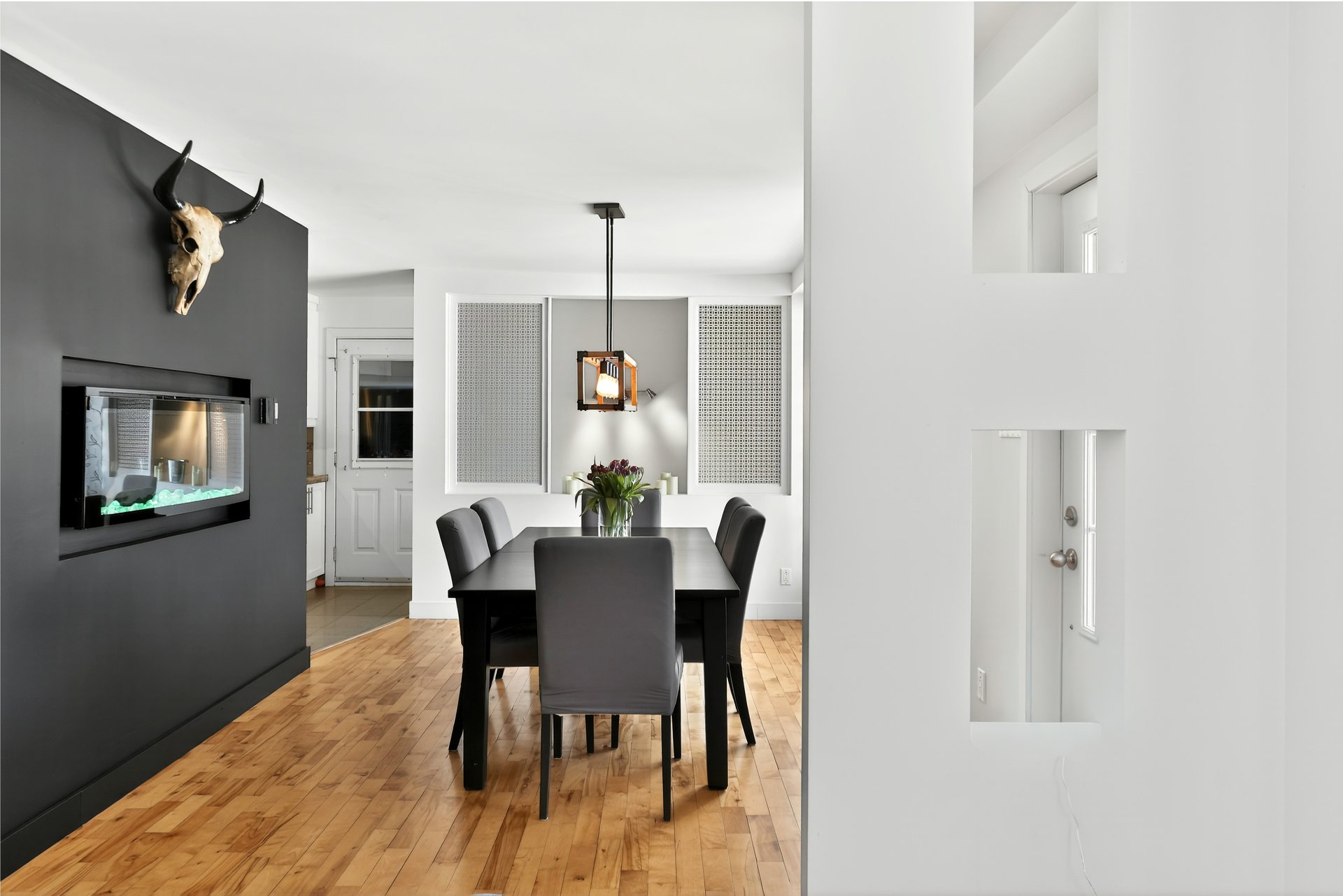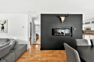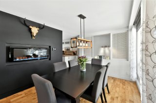 murale intégrée et une salle à manger agrémentée d'un foyer