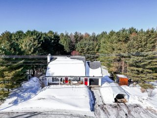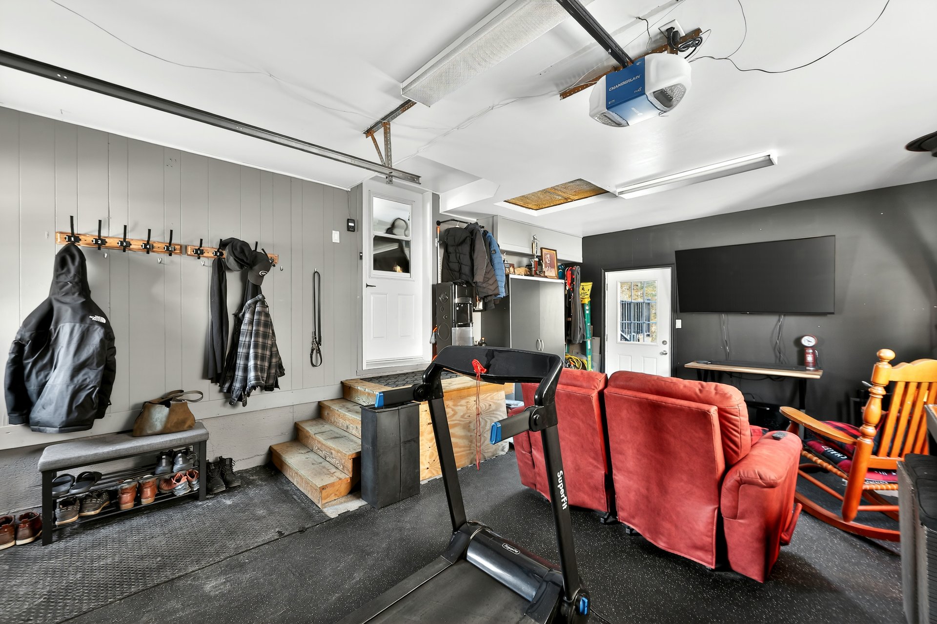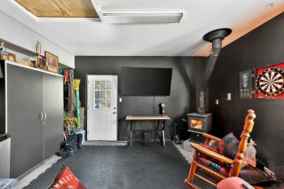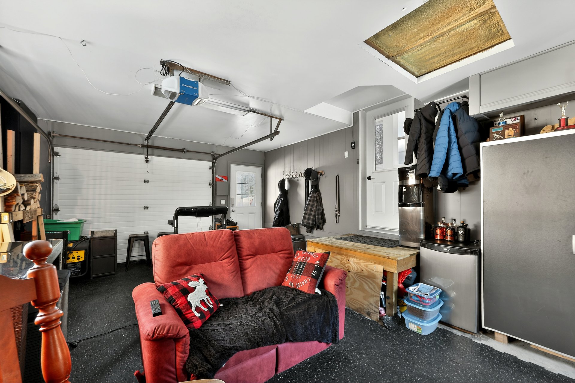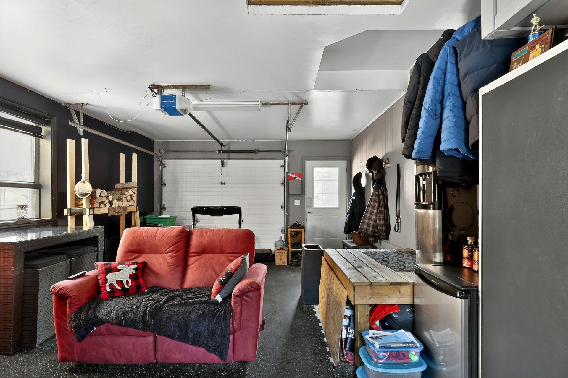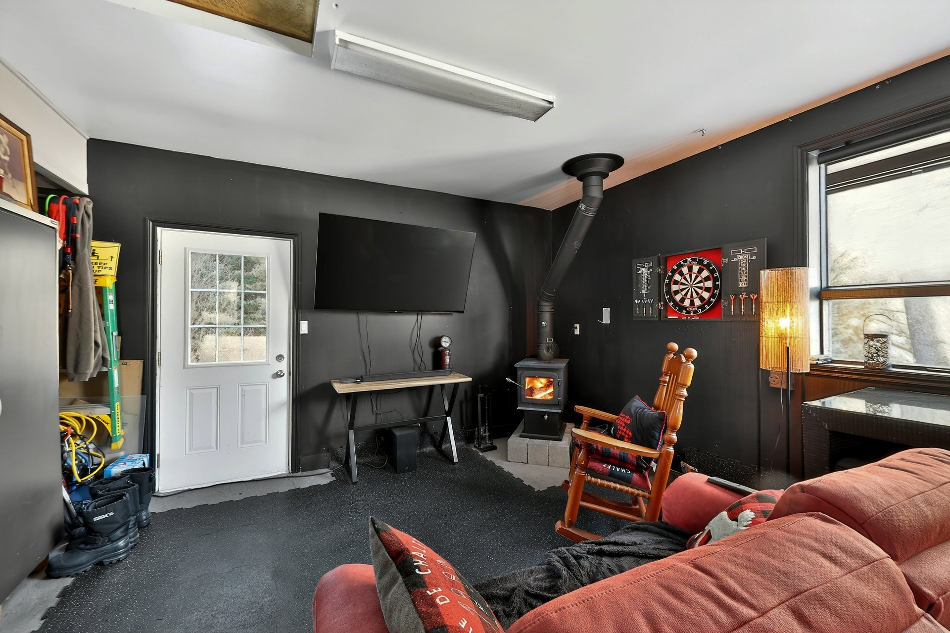 Le grand garage attaché et chauffé, équipé d'un poêle à