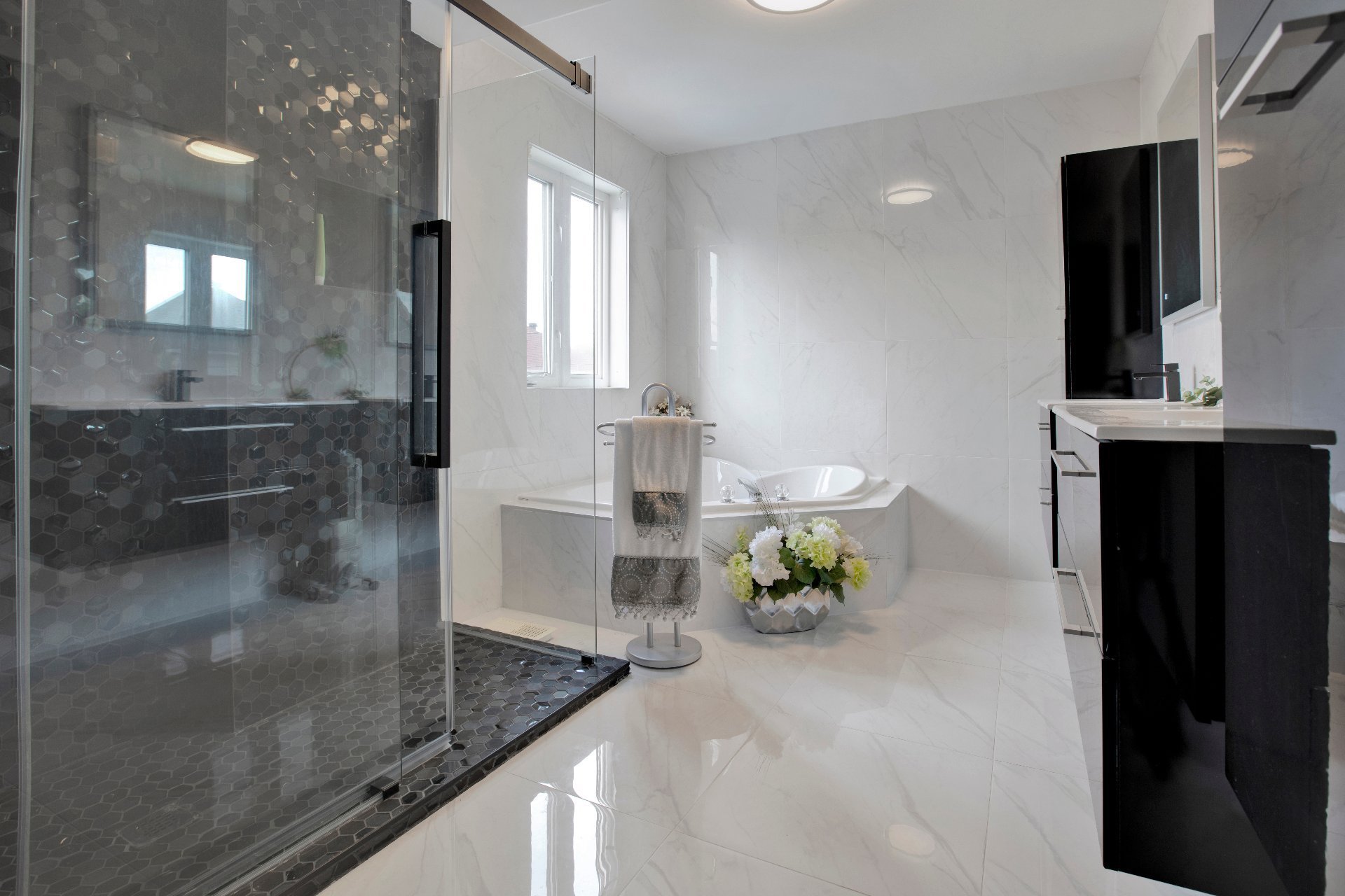 bain privée avec bain de coin, douche séparée et deux