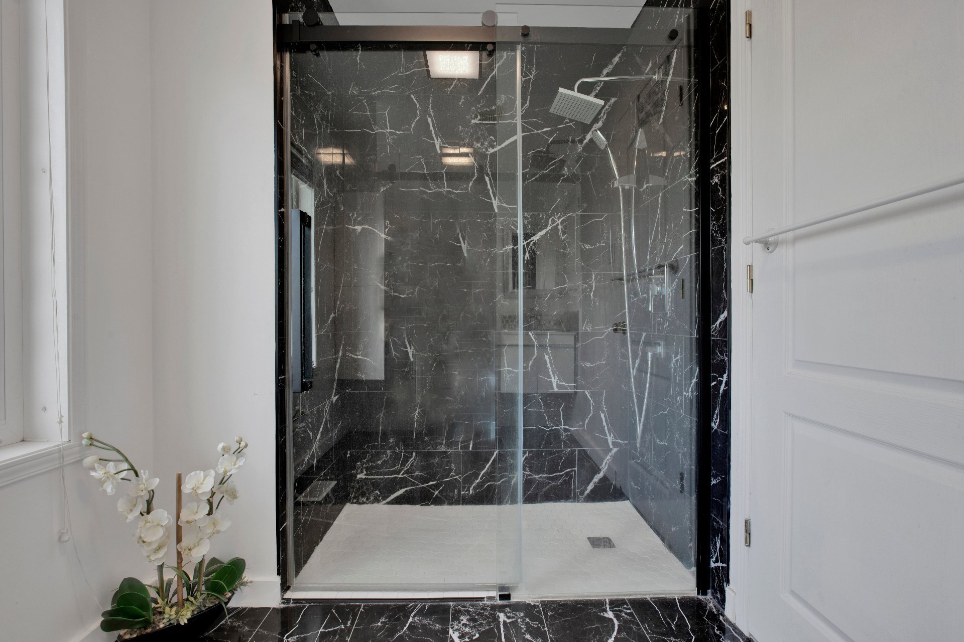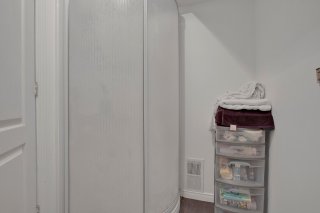 avec douche de coin, une salle de lavage avec chute à linge