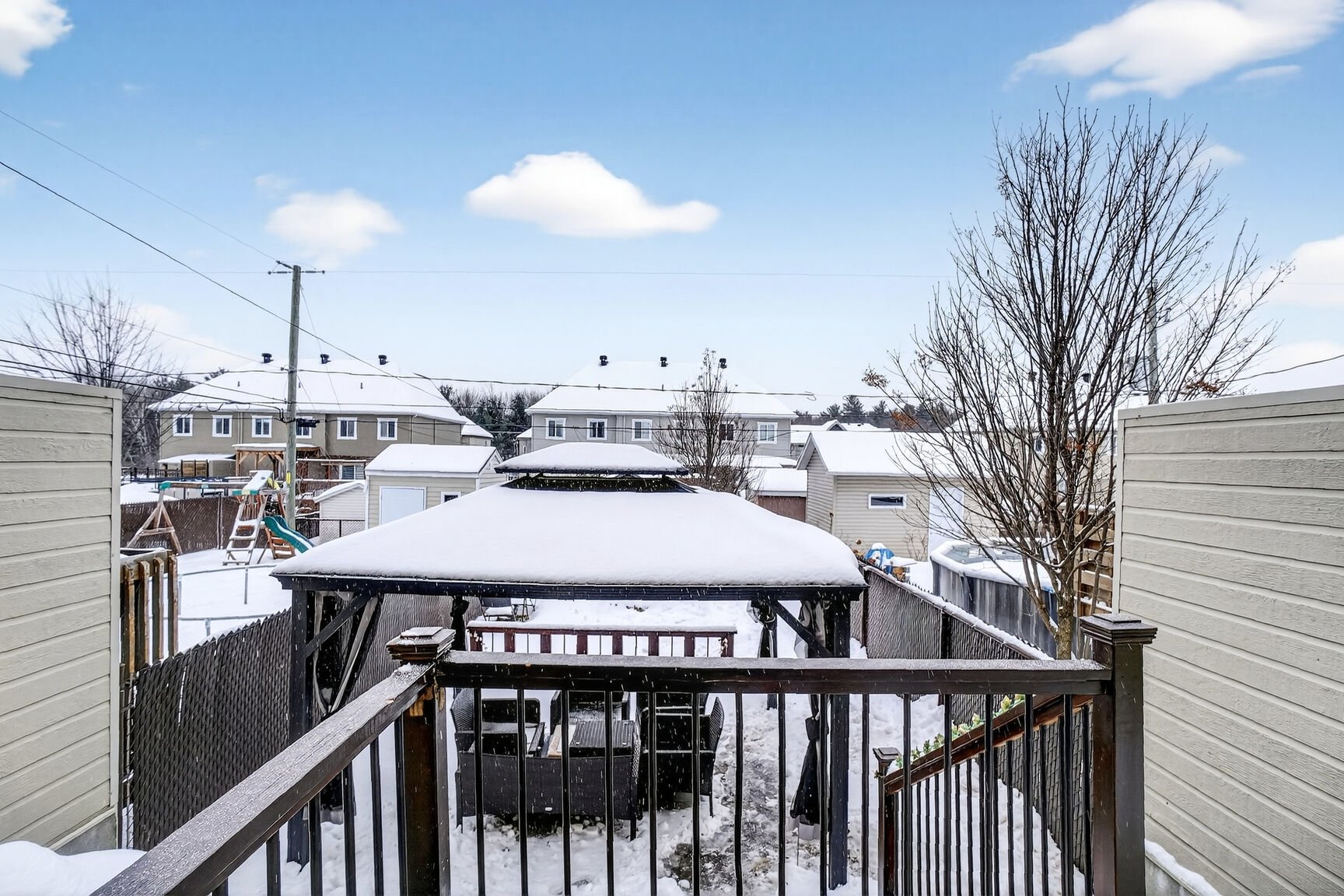 Inclus : Luminaire, Stors, Fixtures, Échangeur d'aire, Gazebo, Foyer à gaz, climatiseur, meubles d'éxterieur, BBQ.