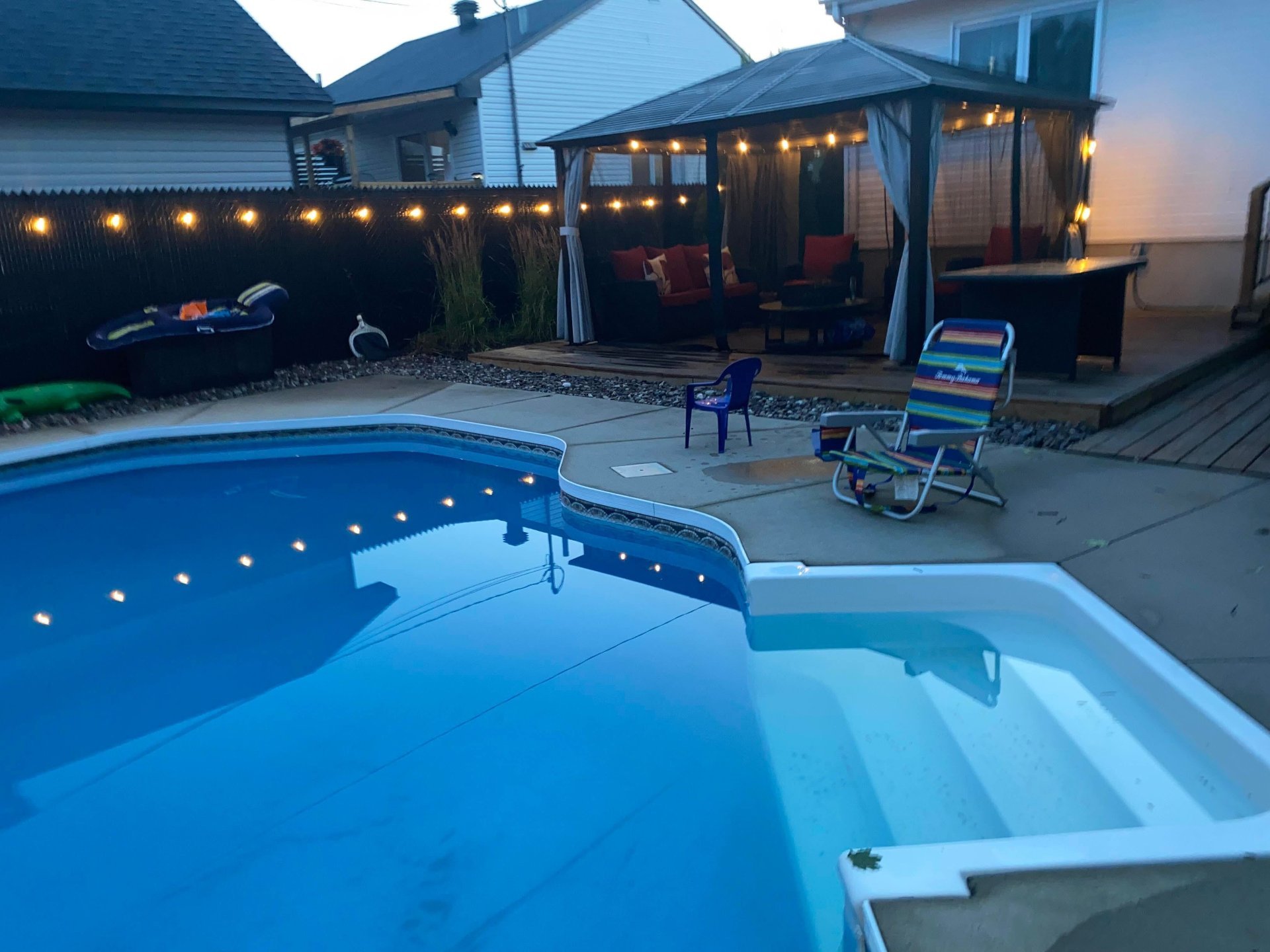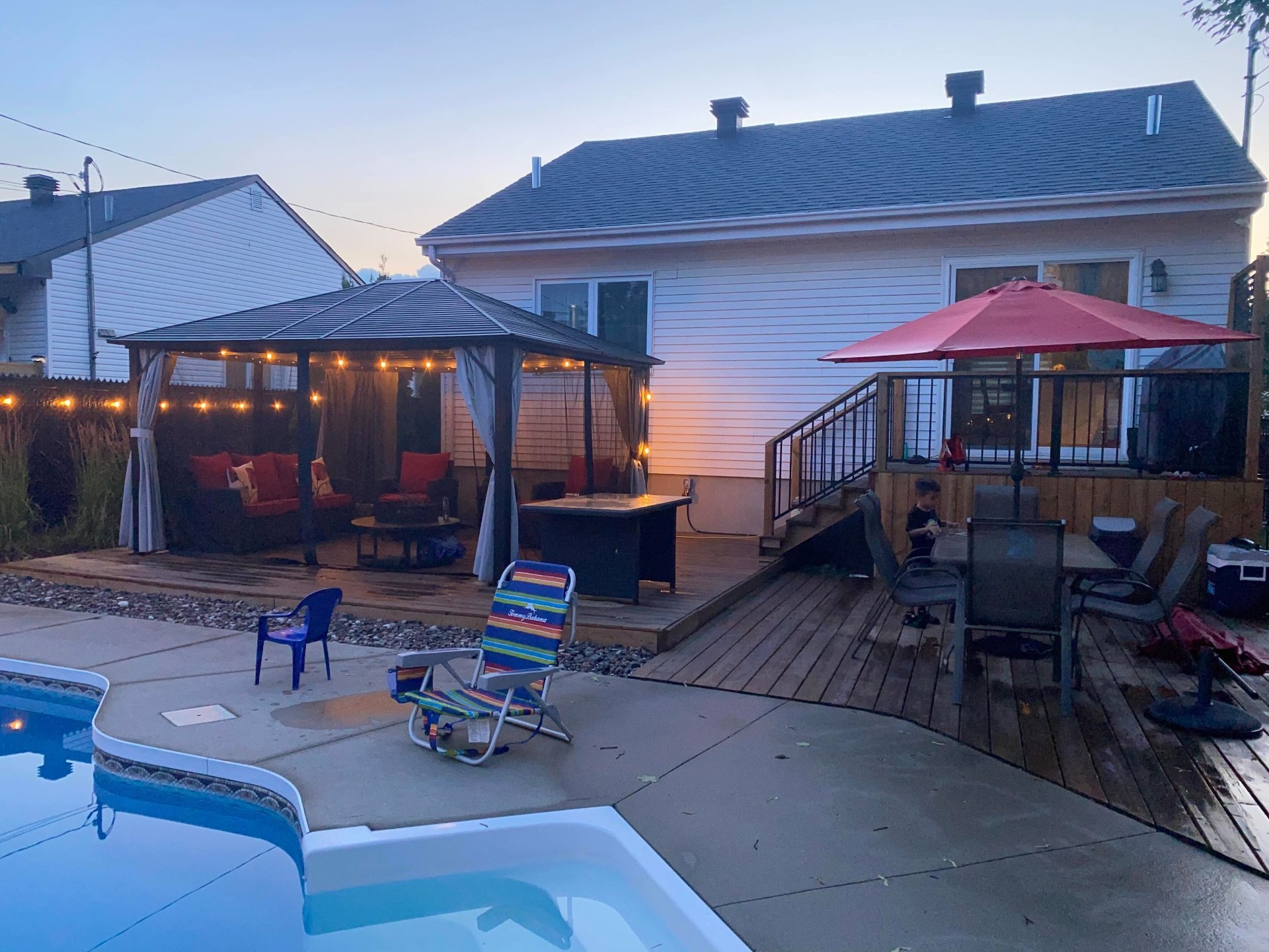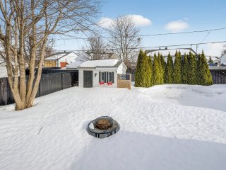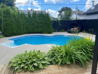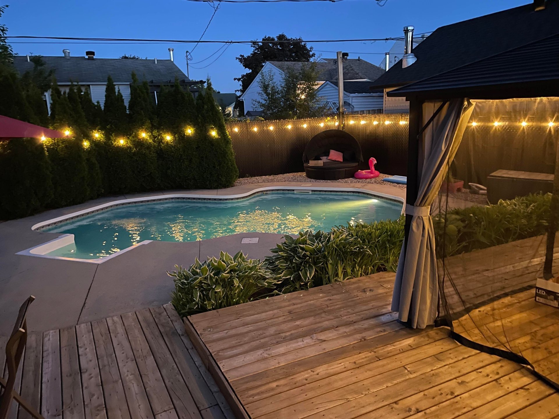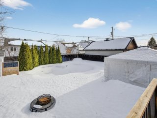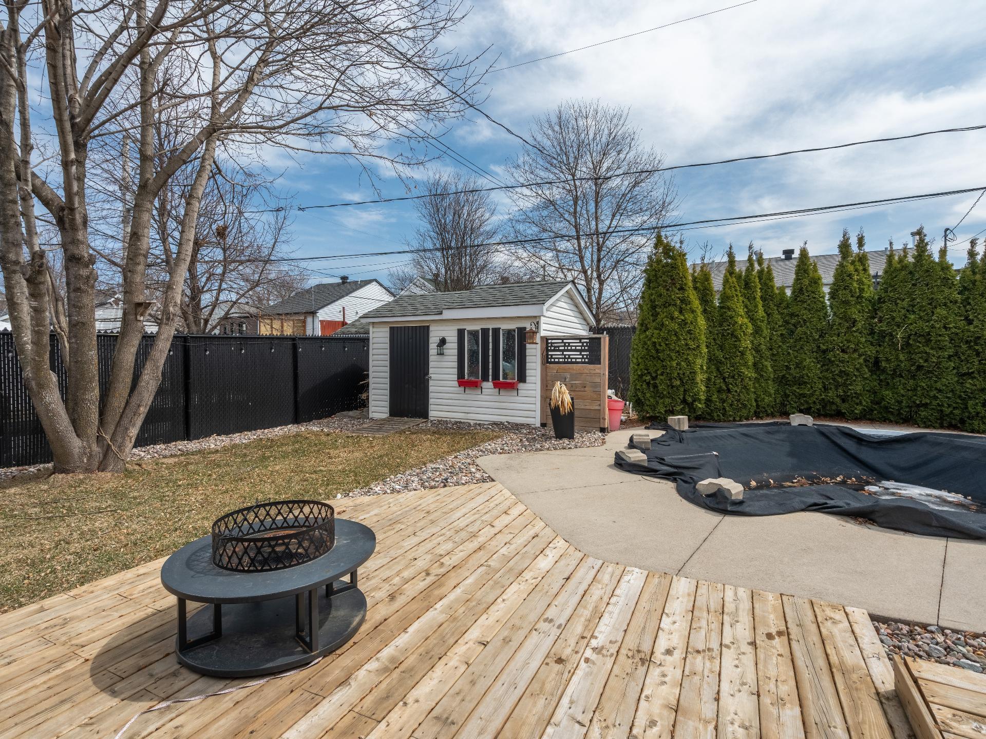 À l'extérieur, vous trouverez une cour intime et clôturée avec une terrasse en bois, un espace feu pour vos soirées entre amis et une piscine creusée, parfaite pour profiter de la belle saison. Un cabanon complète l'espace, offrant du rangement pratique.