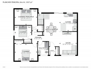 | Chambre à coucher principale | 13.9 x 9.8 P | Rez-de-chaussée | Bois |
