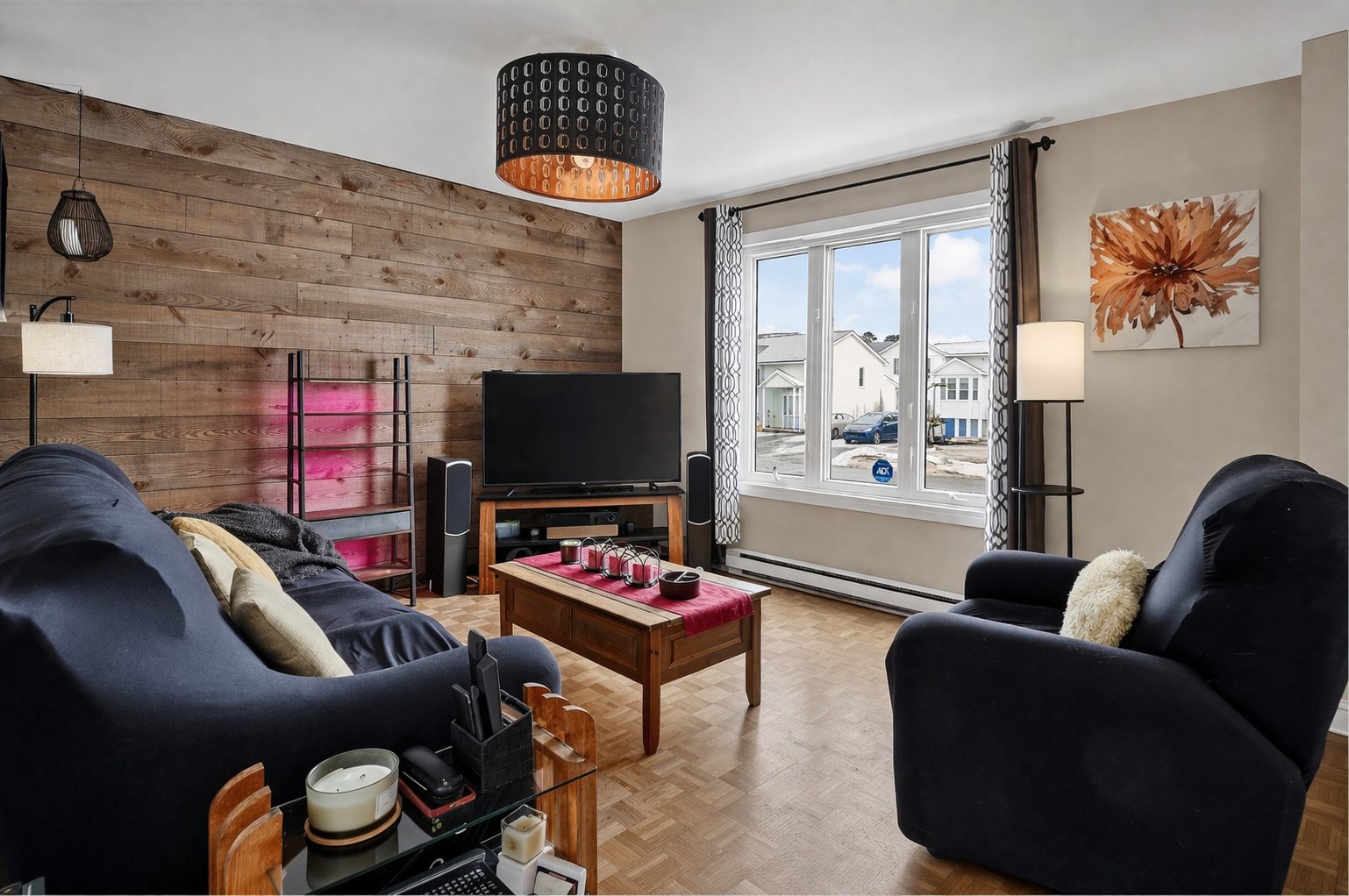 Inclus : Thermopompe, îlot de cuisine, chauffe-eau (2024), séparation, stores, luminaires, étagères de salle de bain, micro-ondes