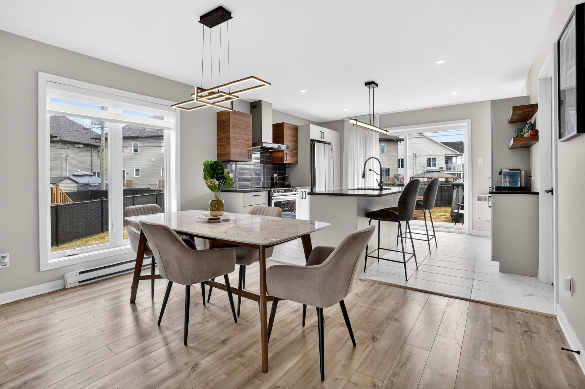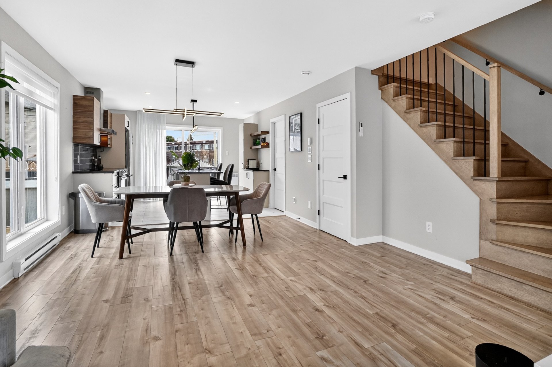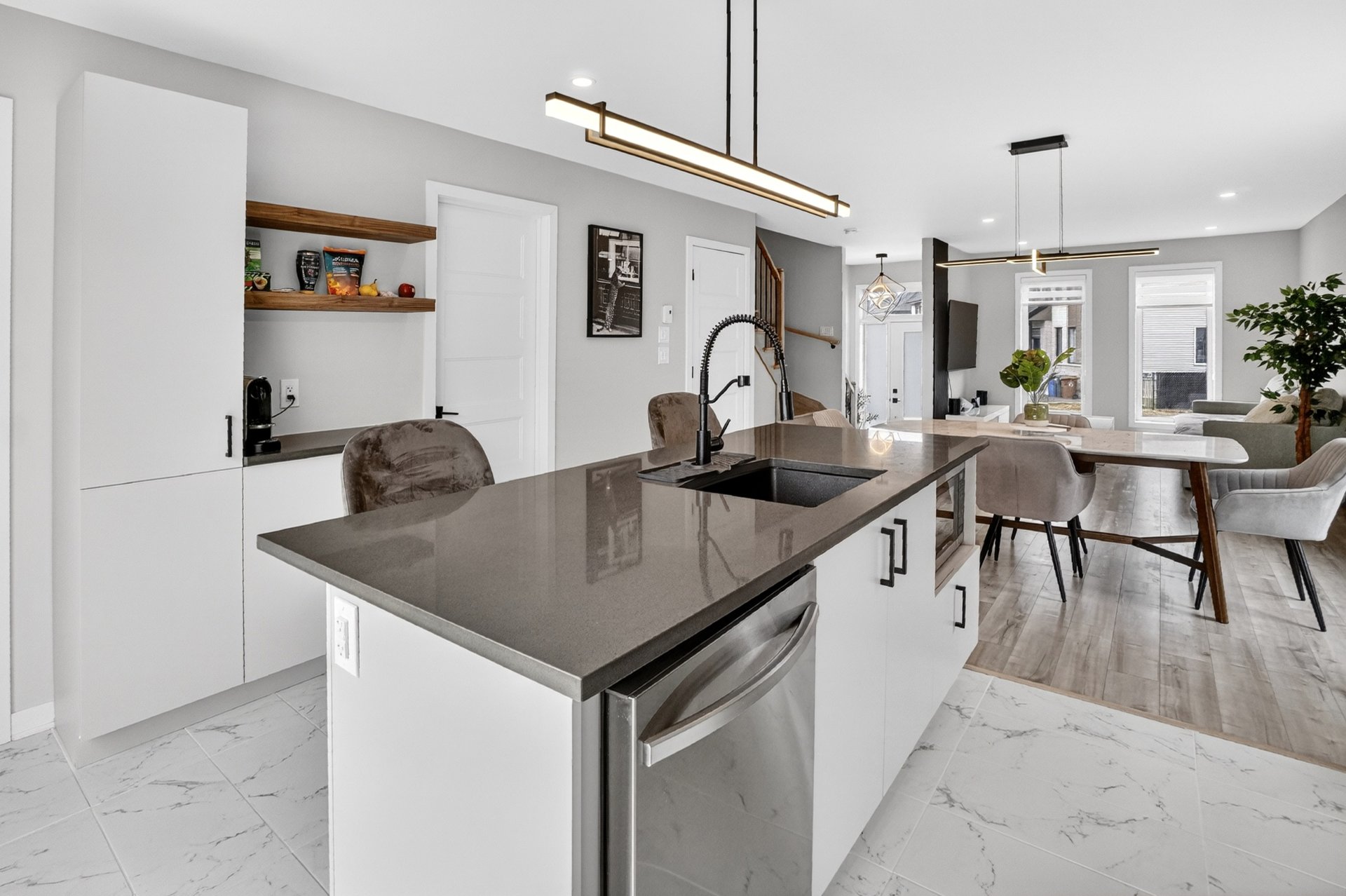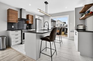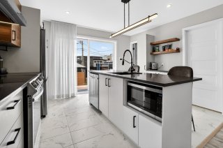 Dès l'entrée, vous serez impressionné par l'espace de vie à aire ouverte, baigné de lumière naturelle. Le salon, la salle à manger et la cuisine s'intègrent parfaitement, offrant un environnement moderne et fonctionnel. La cuisine propose des comptoirs de quartz, des armoires au goût du jour et une finition soignée. Des encastrés ont été ajoutés au plafond, accentuant l'ambiance chaleureuse et contemporaine.