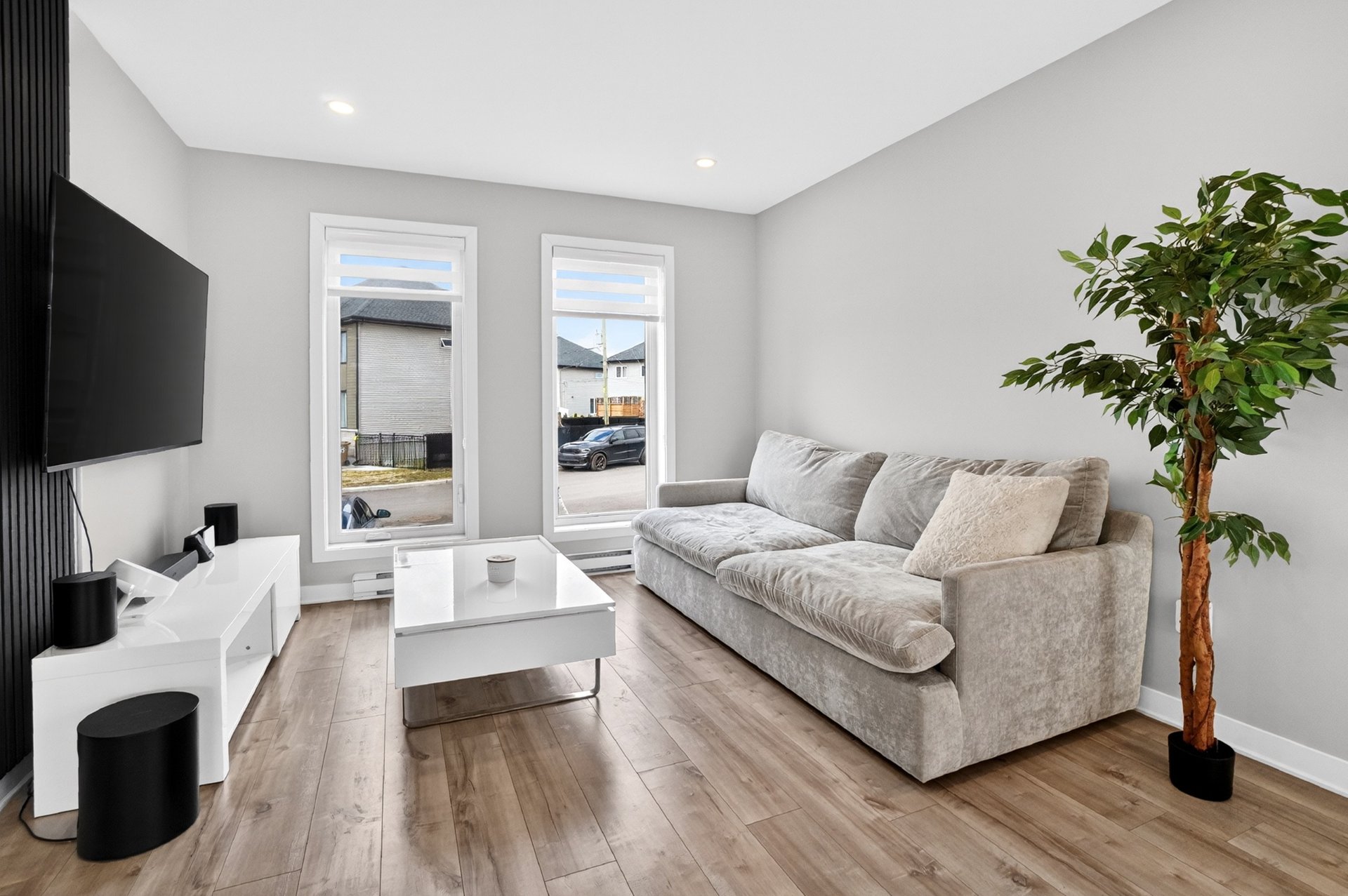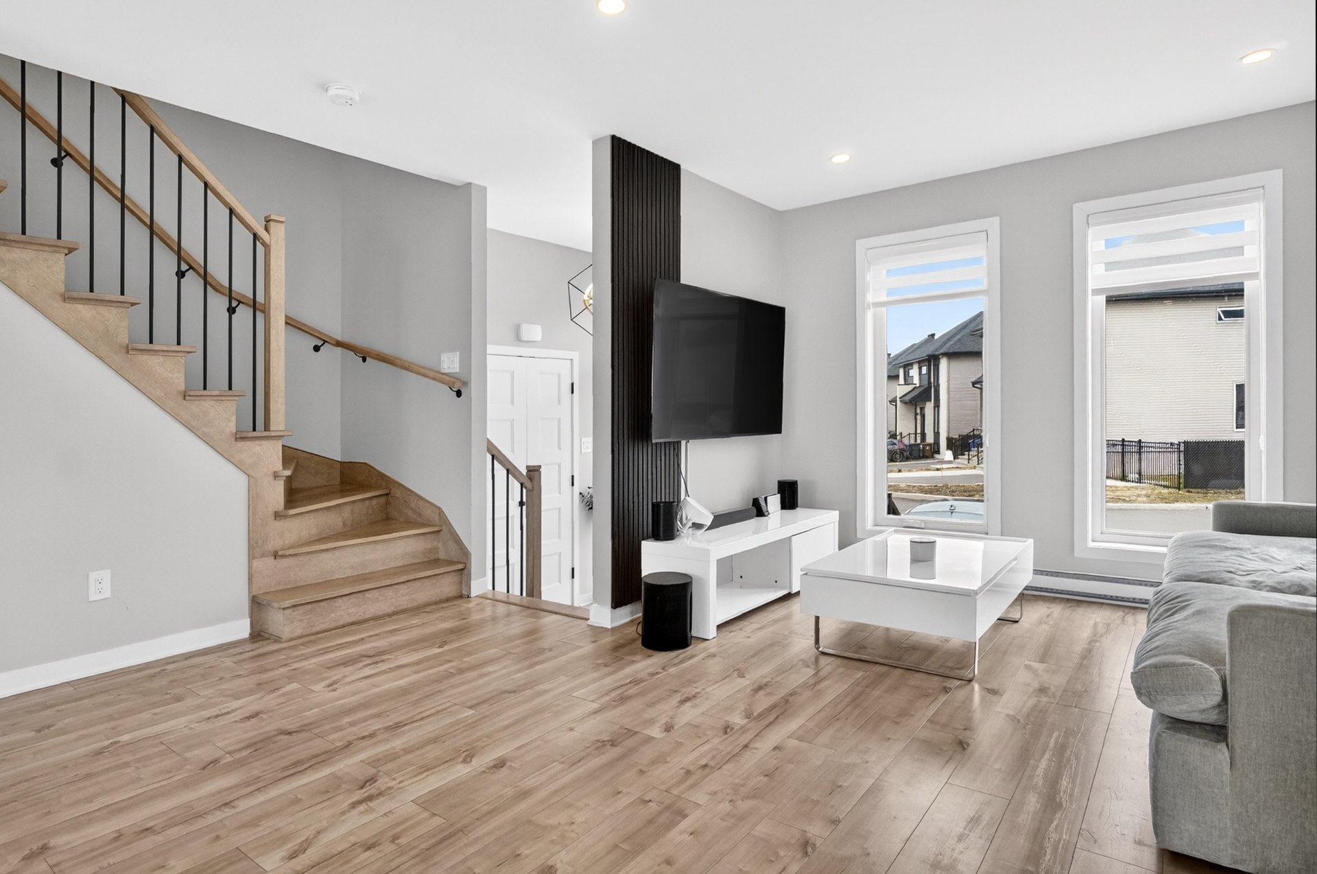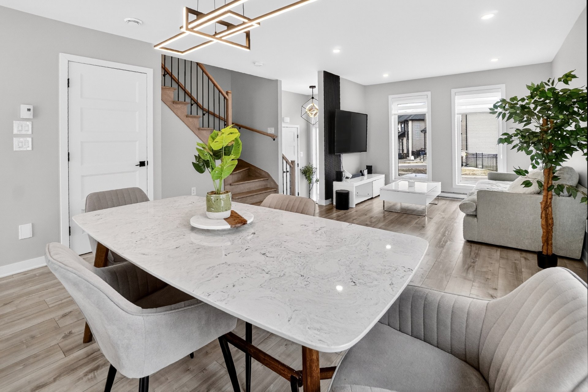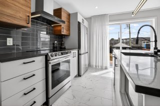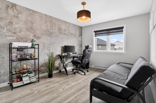 Dès l'entrée, vous serez impressionné par l'espace de vie à aire ouverte, baigné de lumière naturelle. Le salon, la salle à manger et la cuisine s'intègrent parfaitement, offrant un environnement moderne et fonctionnel. La cuisine propose des comptoirs de quartz, des armoires au goût du jour et une finition soignée. Des encastrés ont été ajoutés au plafond, accentuant l'ambiance chaleureuse et contemporaine.