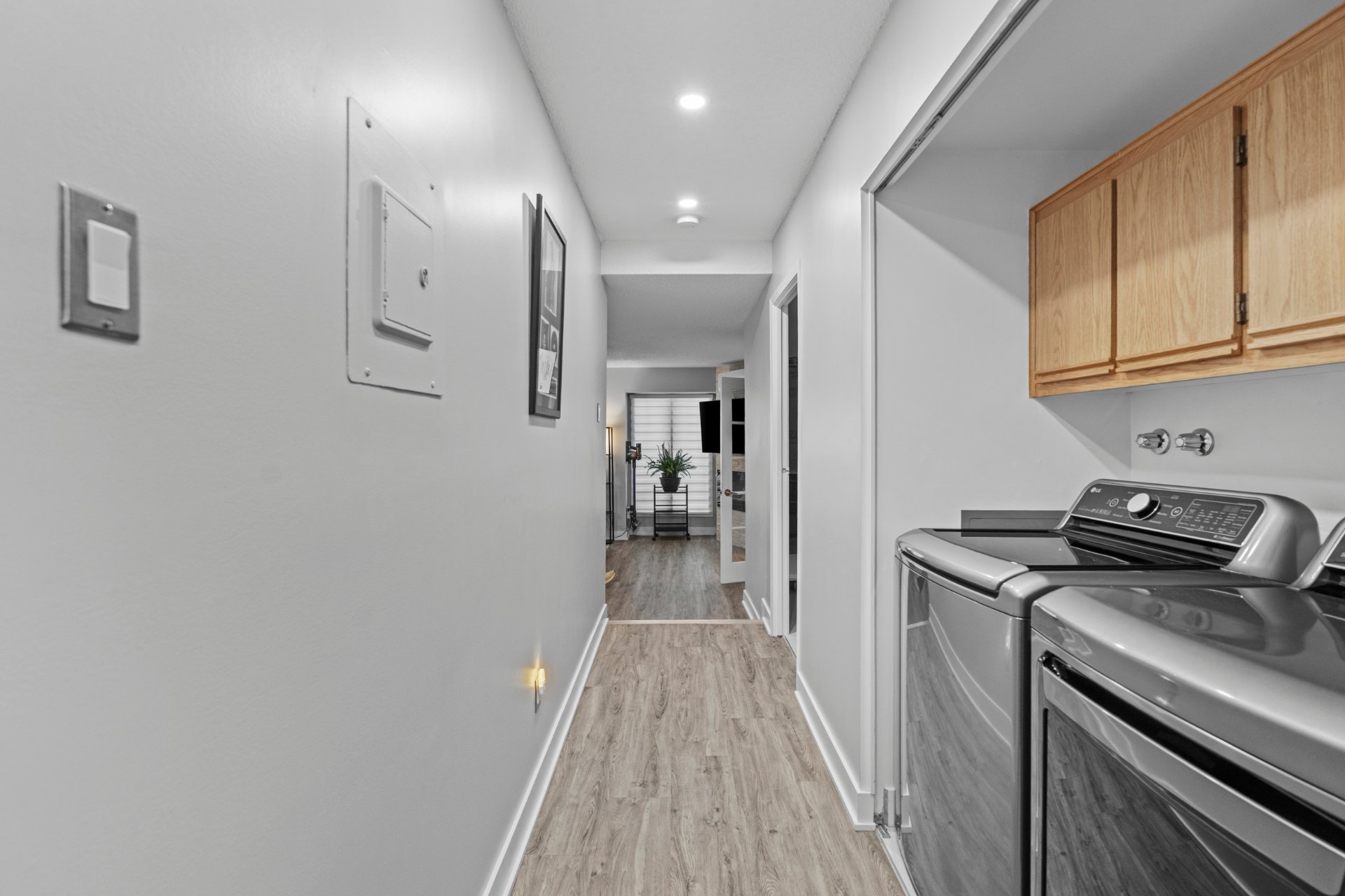 hall d'entrée fermé, un salon chaleureux avec foyer et mur