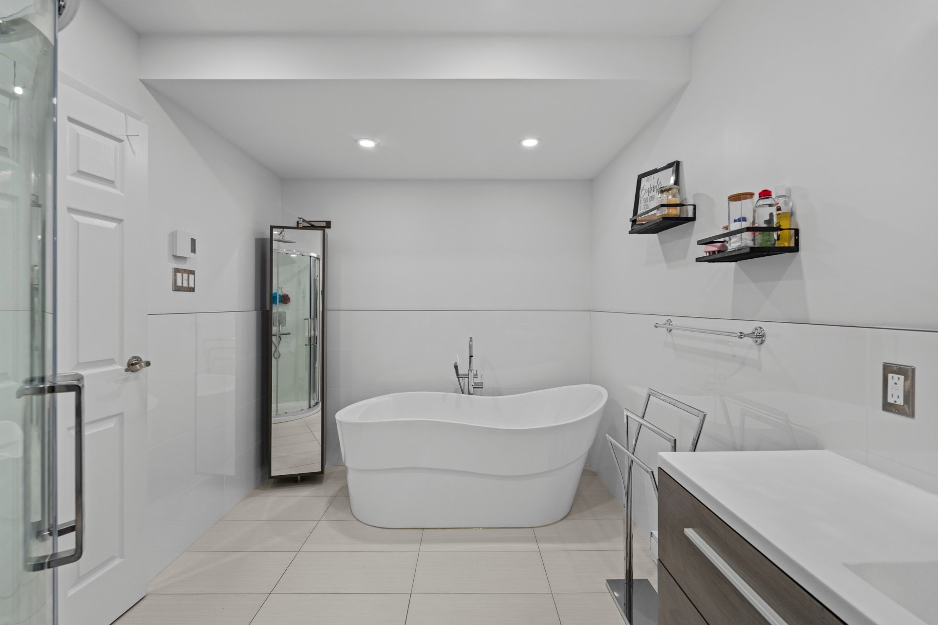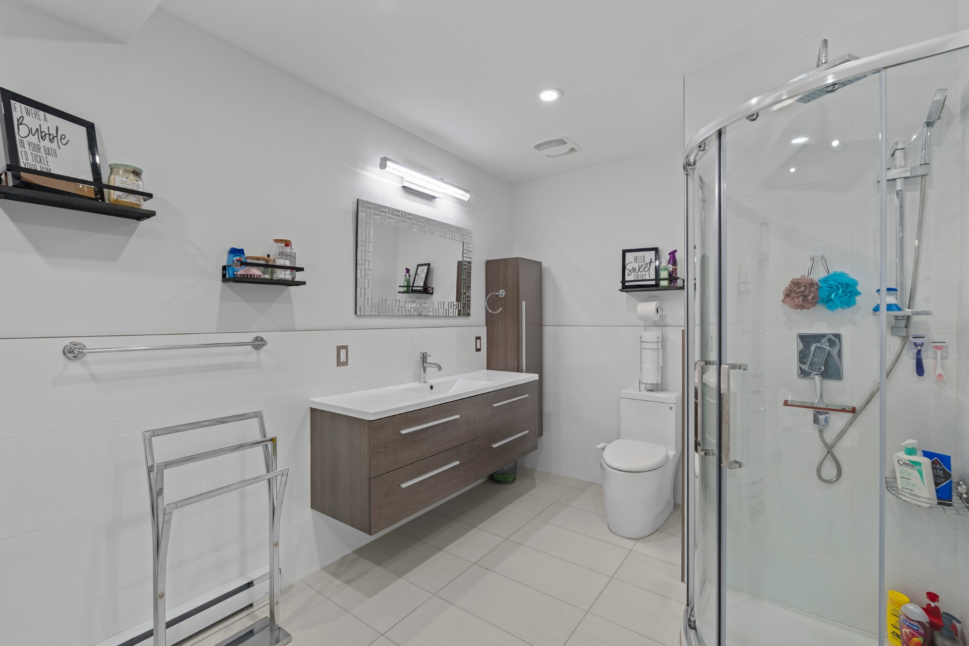 autoportant, douche en coin et un espace lavage discret.