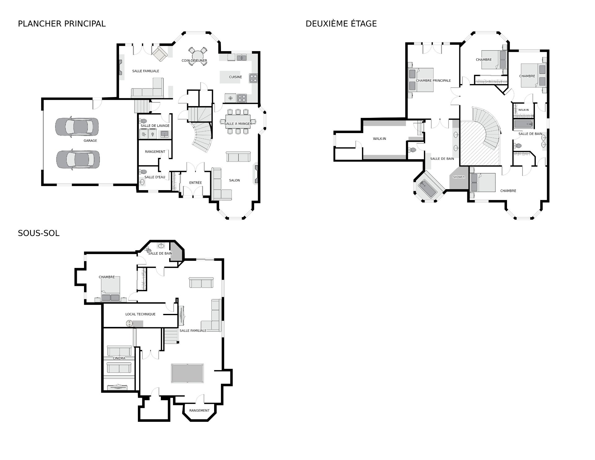 Exclus : Tout le mobilier intérieur et extérieur, tous les effets personnels, la laveuse et la sécheuse, le miroir du hall d'entrée, les tableaux, les décorations, les bouteilles de vin, ainsi que l'écran et le projecteur de la salle de cinéma.