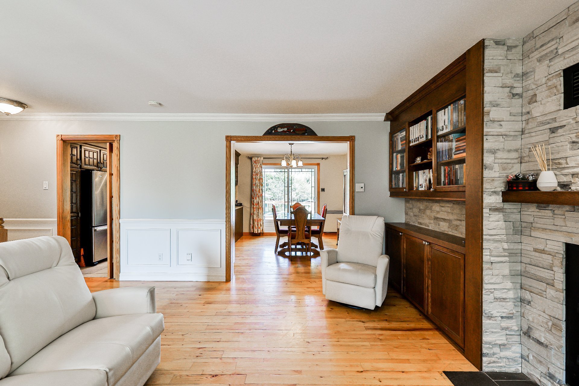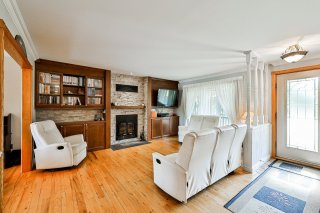 -- Salon lumineux avec unité murale de rangement et foyer