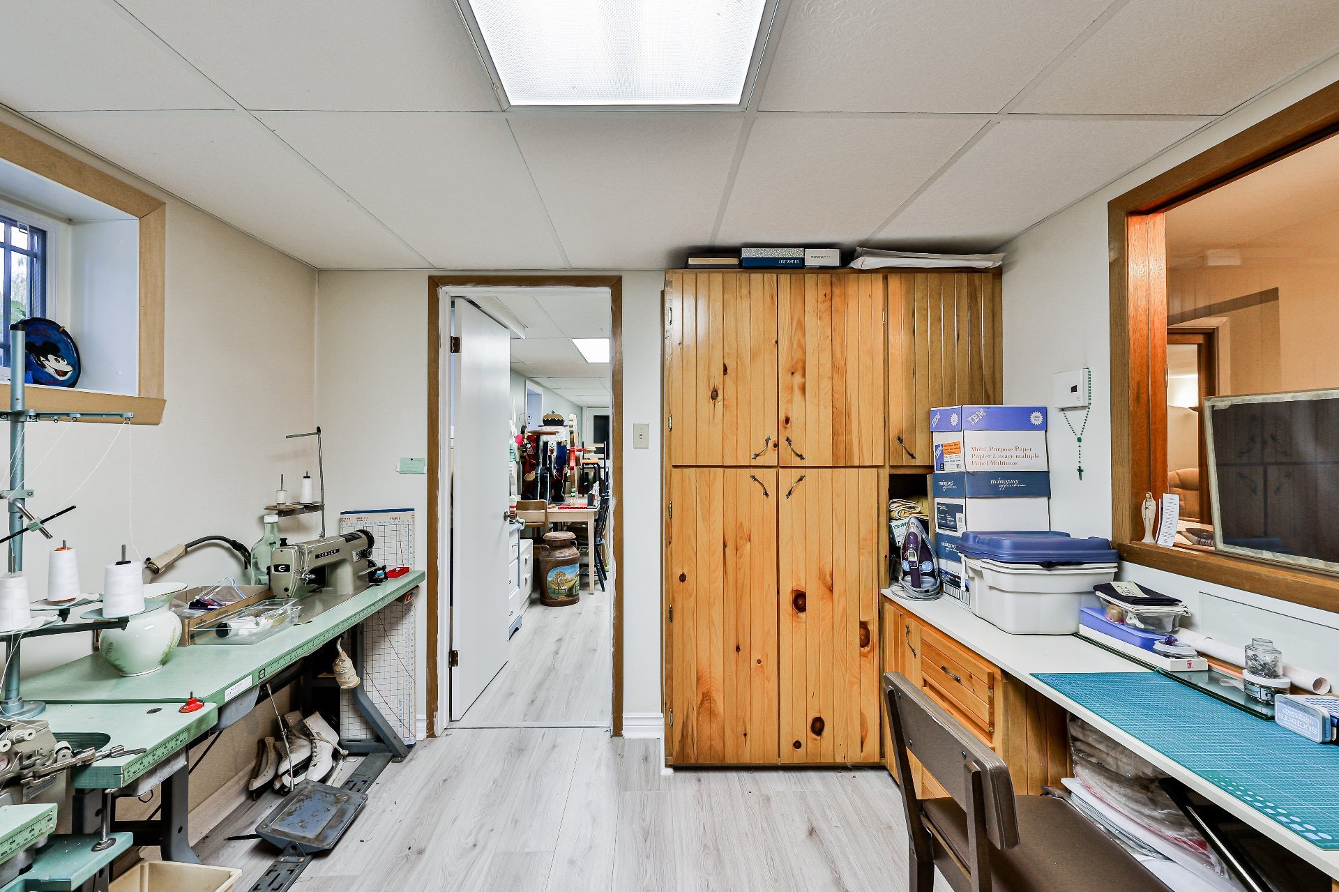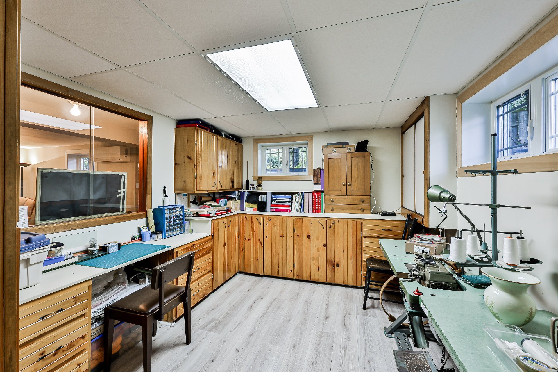 -- Salle de couture avec rangements en bois sur trois murs