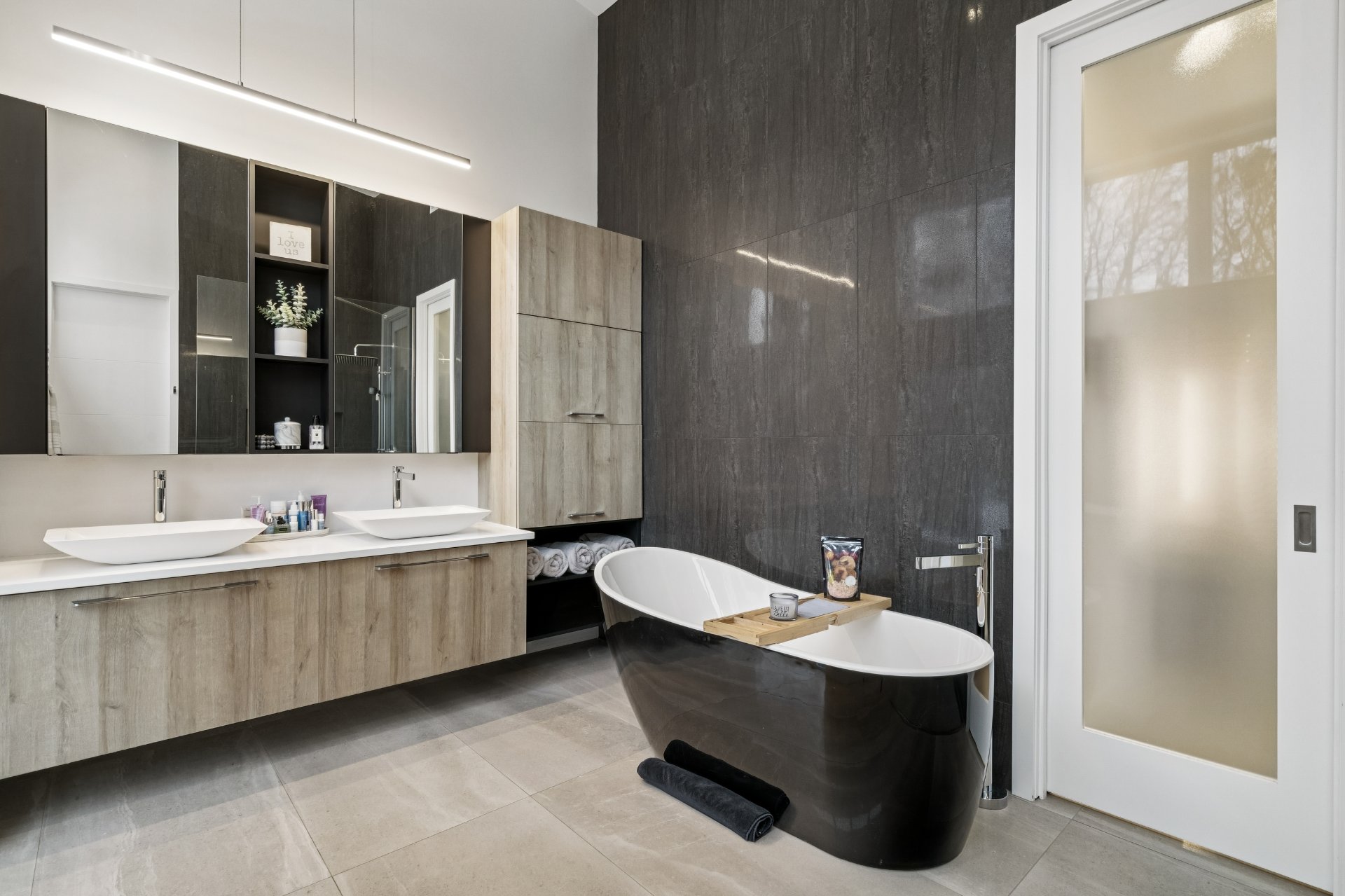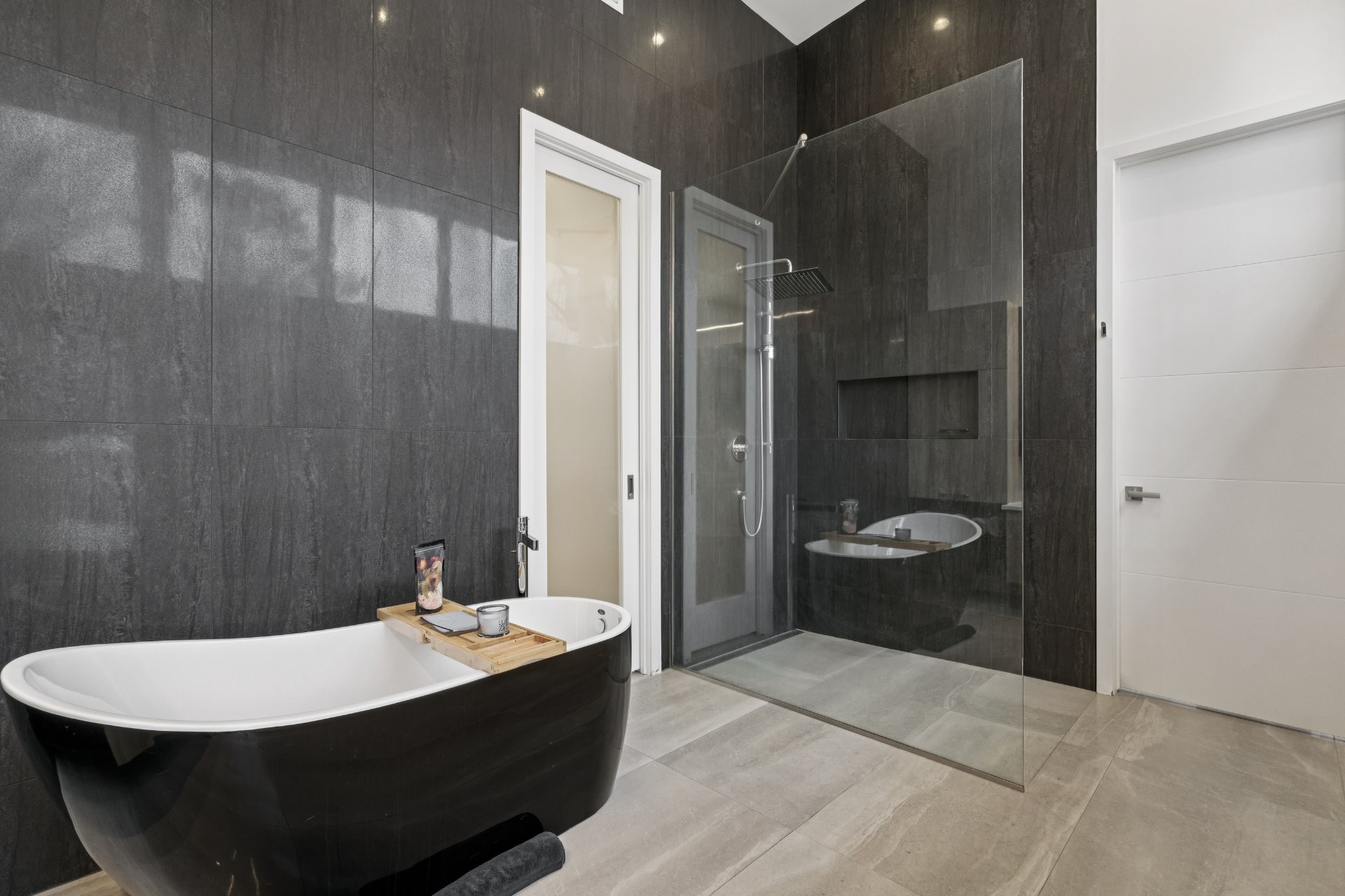 baignoire autoportante noire sculpturale, une douche vitrée
