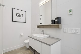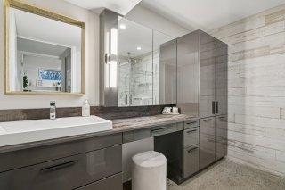 et une vanité flottante, le tout dans une palette de