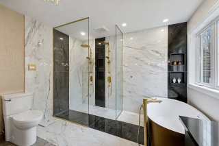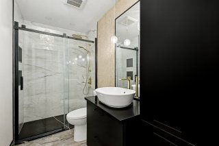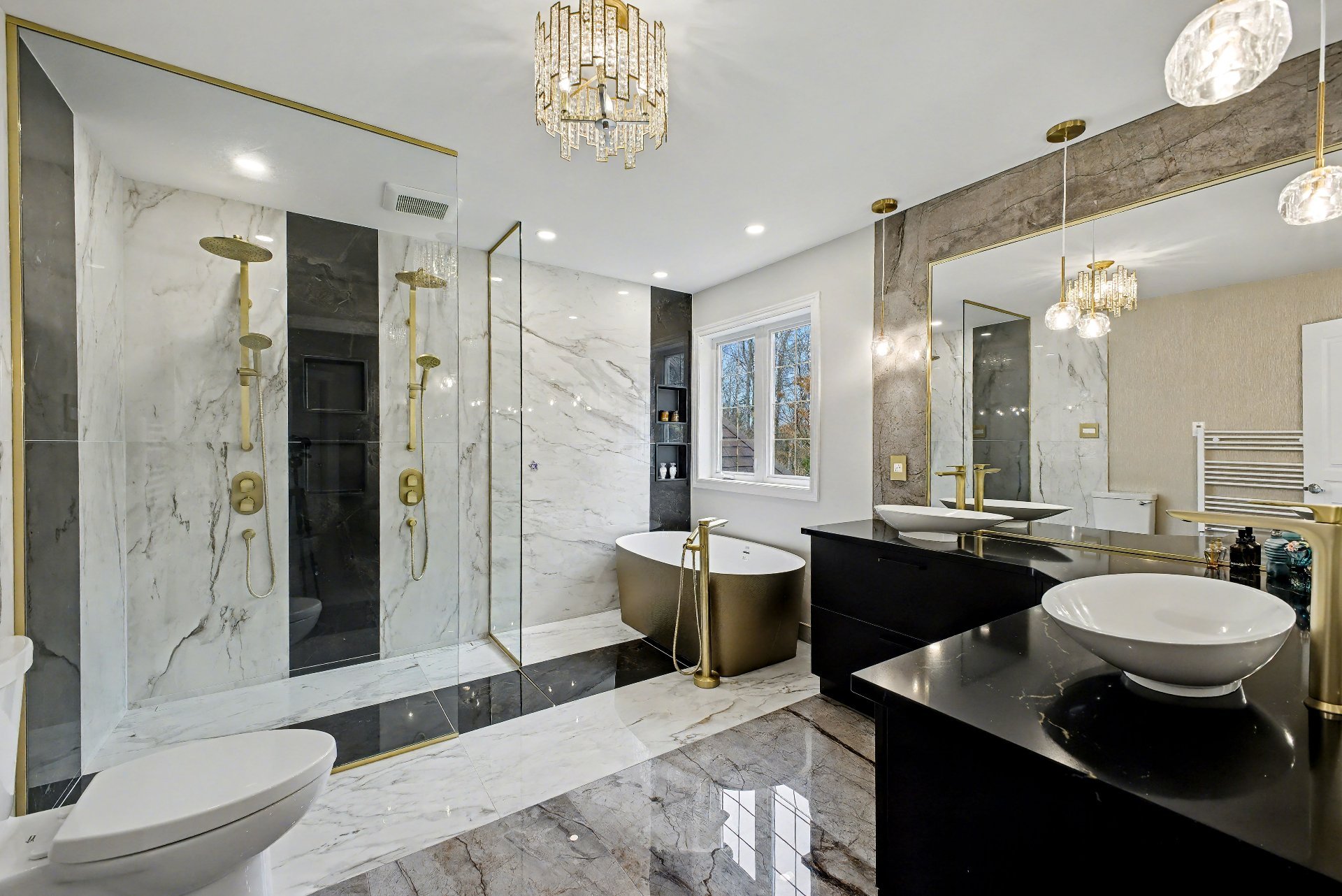 robinetterie dorée et vanité sur mesure avec comptoir de