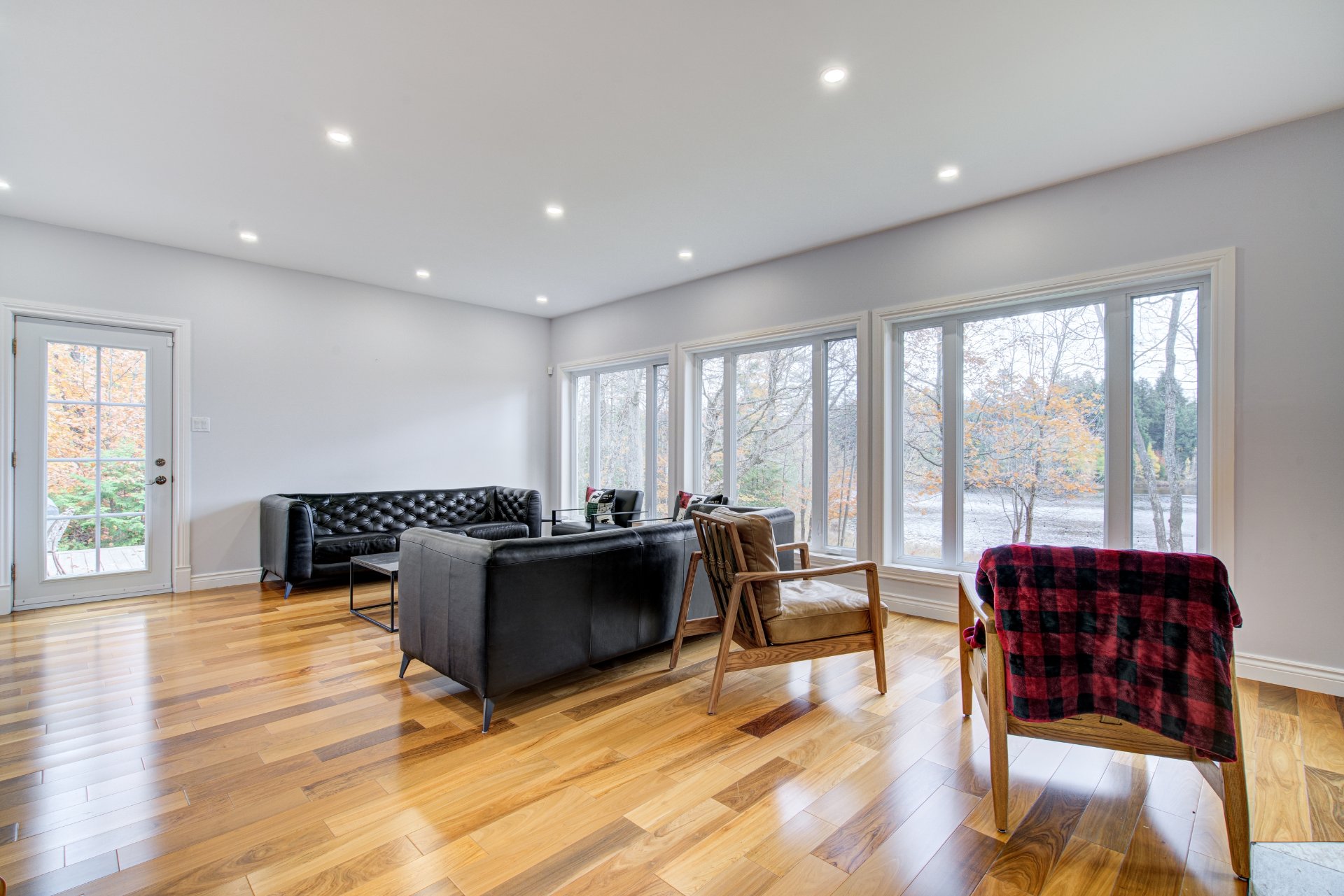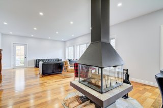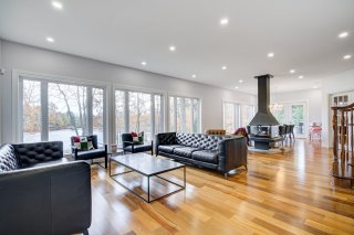 Espace à aire ouverte offrant une vue spectaculaire sur le lac et se distingue par un superbe foyer central. Le salon est spacieux et la cuisine, à la fois élégante et fonctionnelle, contient un îlot central, un coin-repas, un espace cellier, des comptoirs de granit ainsi que des planchers chauffants. La salle à manger est idéale pour recevoir. Un bureau près de l'entrée avec salle d'eau et salle d'attente complète ce niveau, parfait pour le télétravail ou bureau professionnel à domicile. **Tous les électroménagers sont inclus**