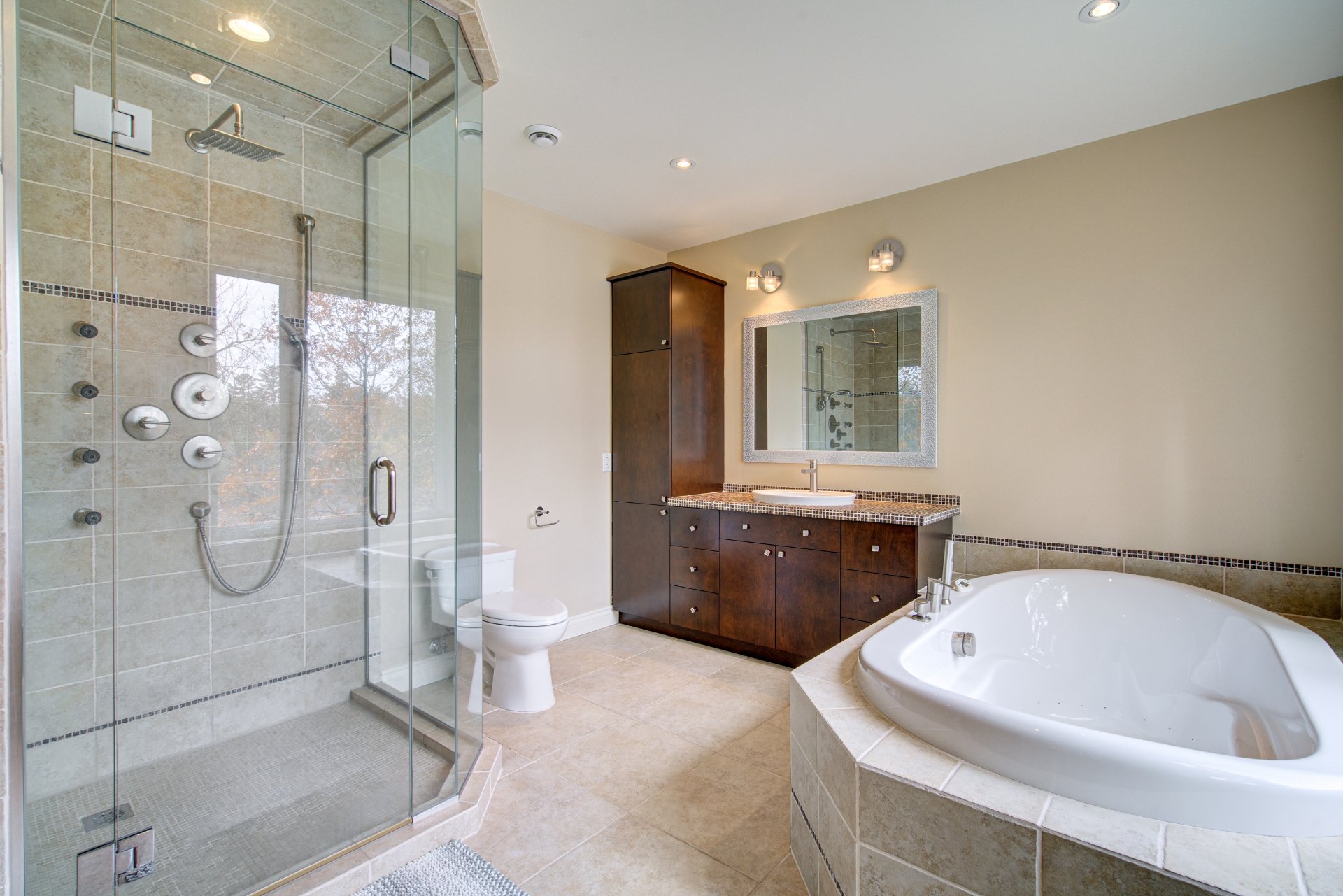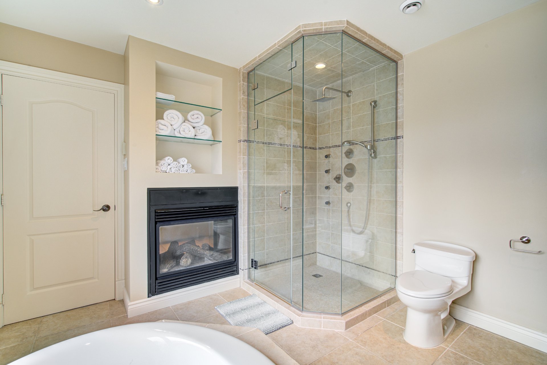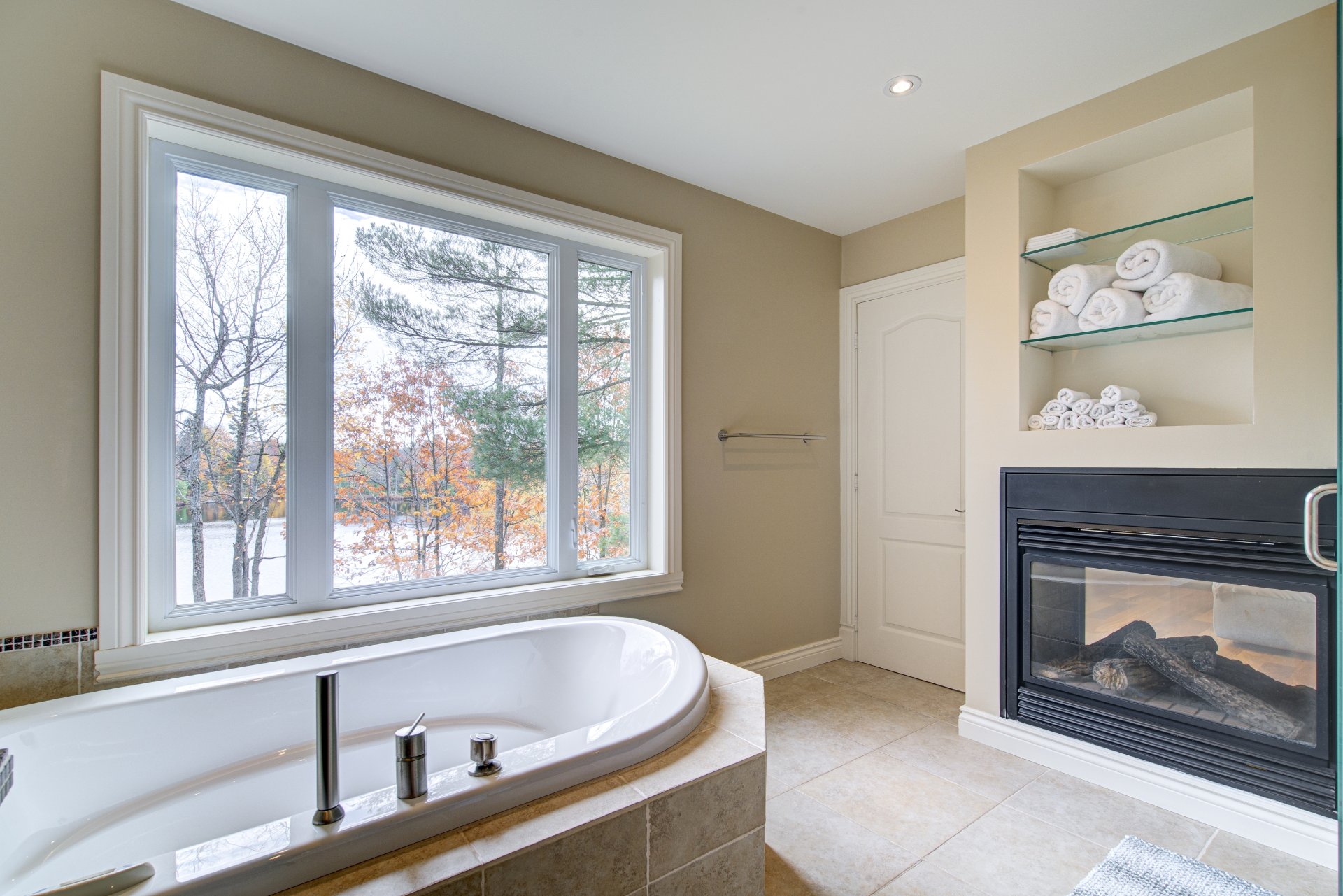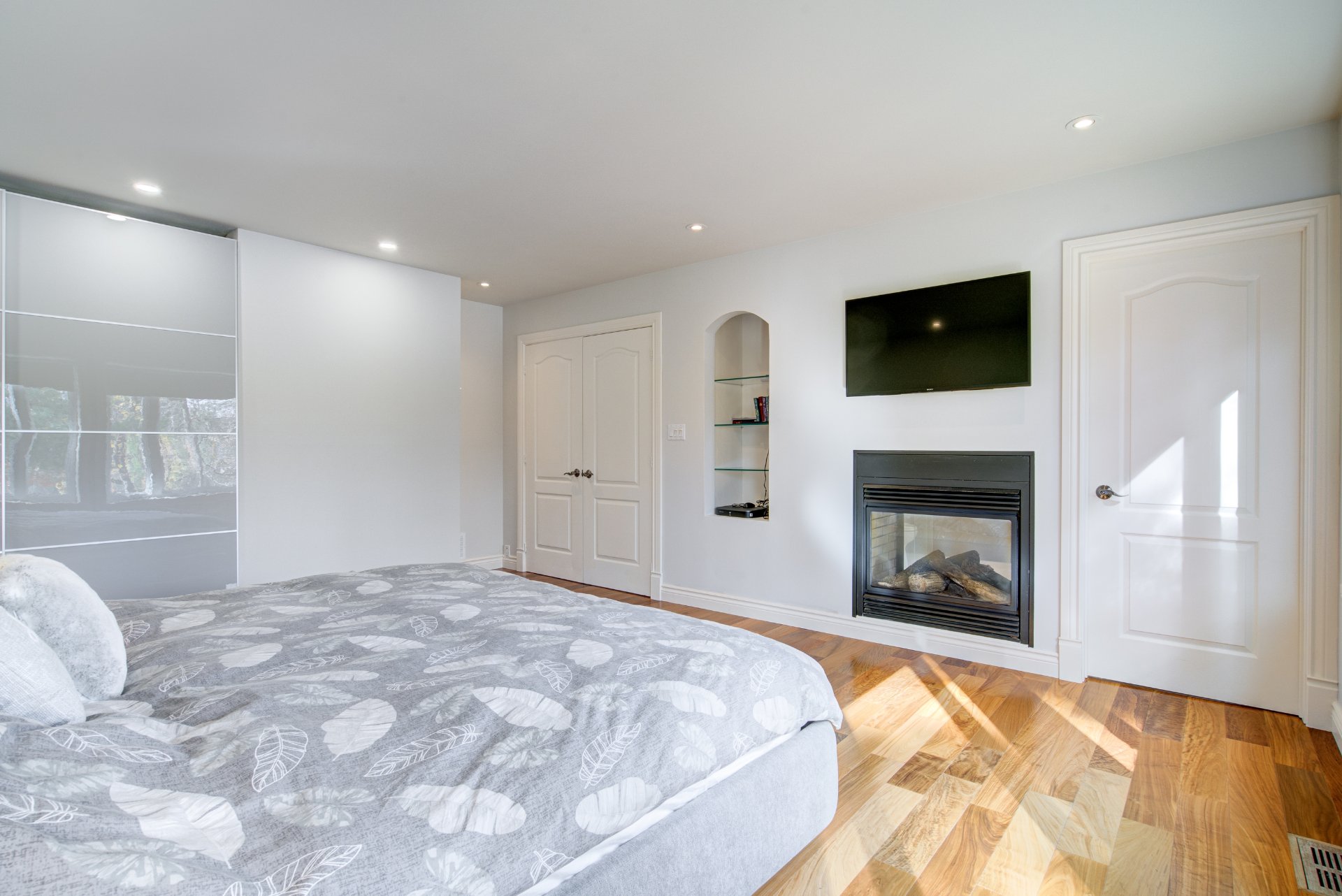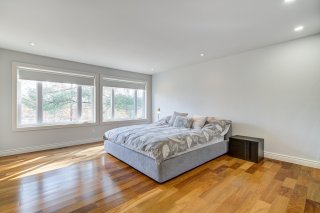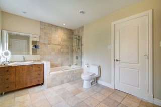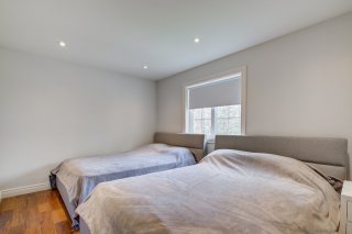 La chambre principale offre une vue imprenable sur le lac, une salle de bains attenante avec bain, douche multi-jets, planchers chauffants et un foyer double face partagé avec la chambre. Un immense walk-in, pouvant servir de troisième chambre, complète cet espace. La seconde chambre est lumineuse et possède également sa propre salle de bains attenante avec plancher chauffant.