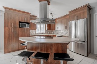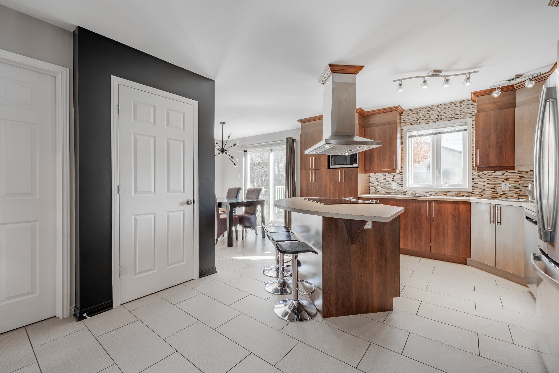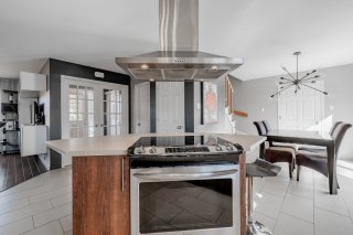 étages, cuisine de chef avec îlot, salle à manger menant à