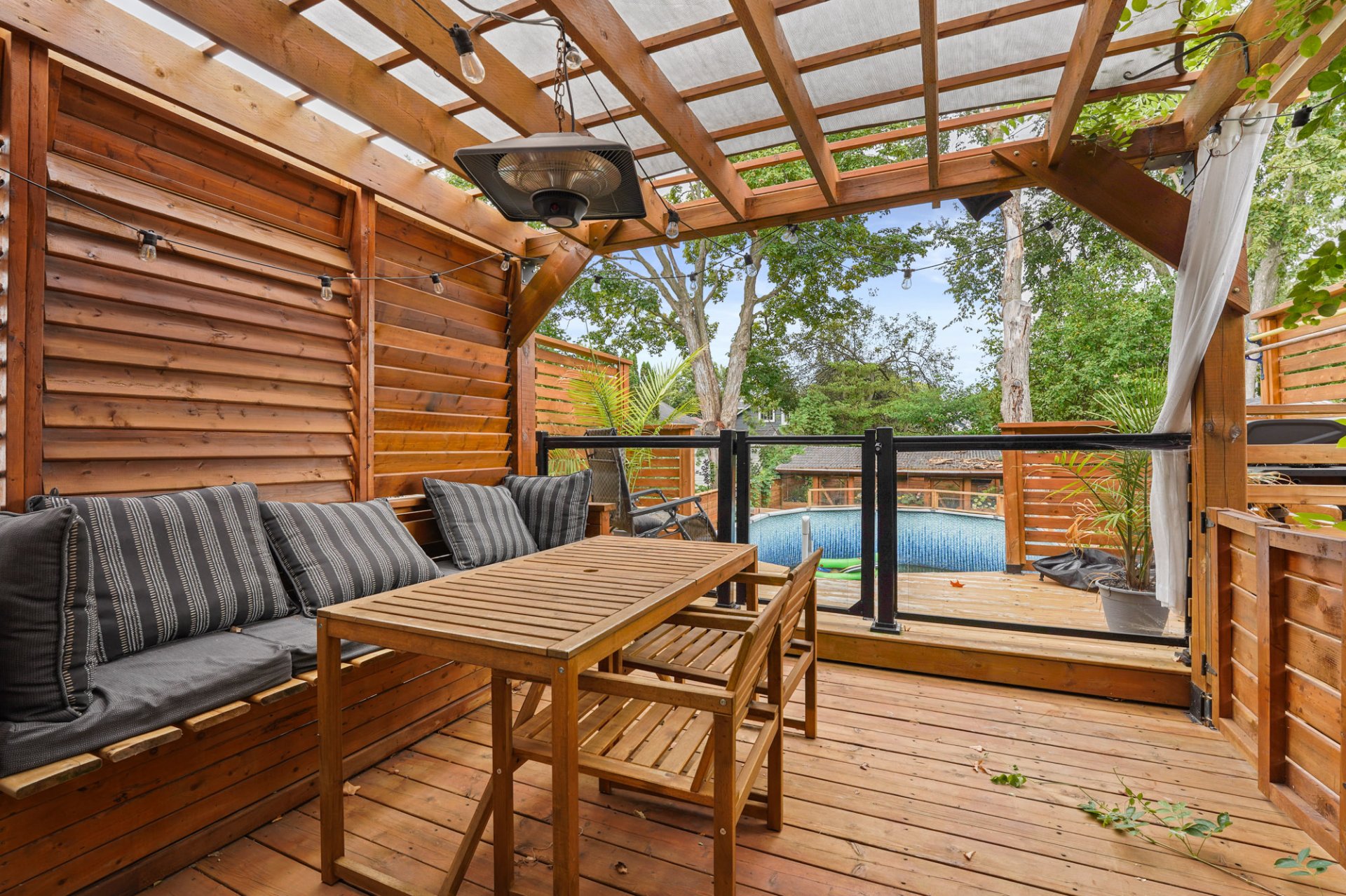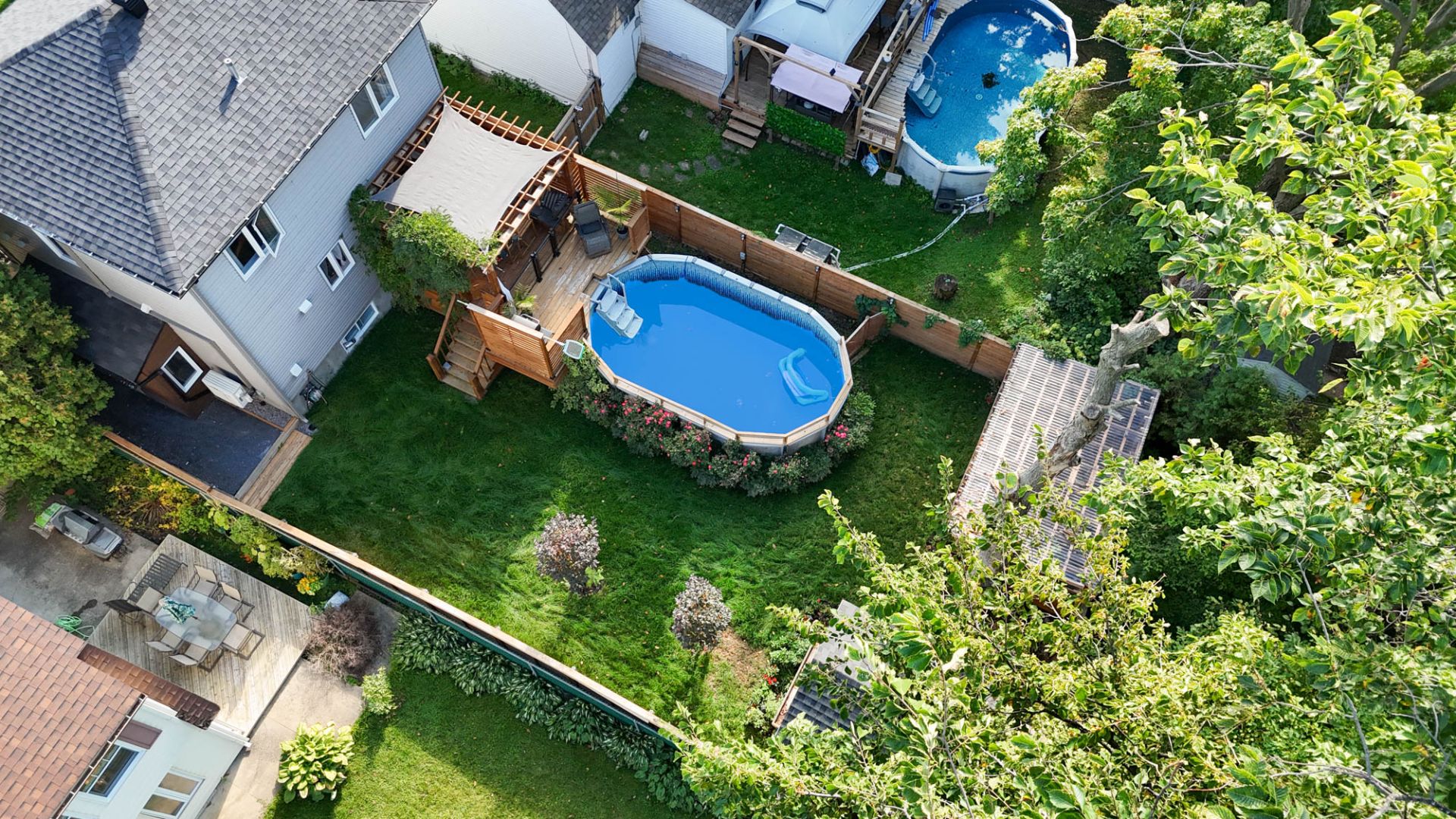 Inclus : Stores, fixtures, luminaires, balayeuse centrale et accessoires, lave-vaisselle, piscine et accessoires, chauffe piscine, système au sel, déshumidificateur