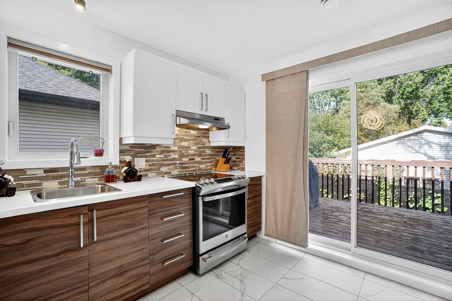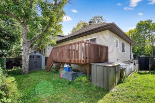 Cour arrière accessible par une grande terrasse en bois