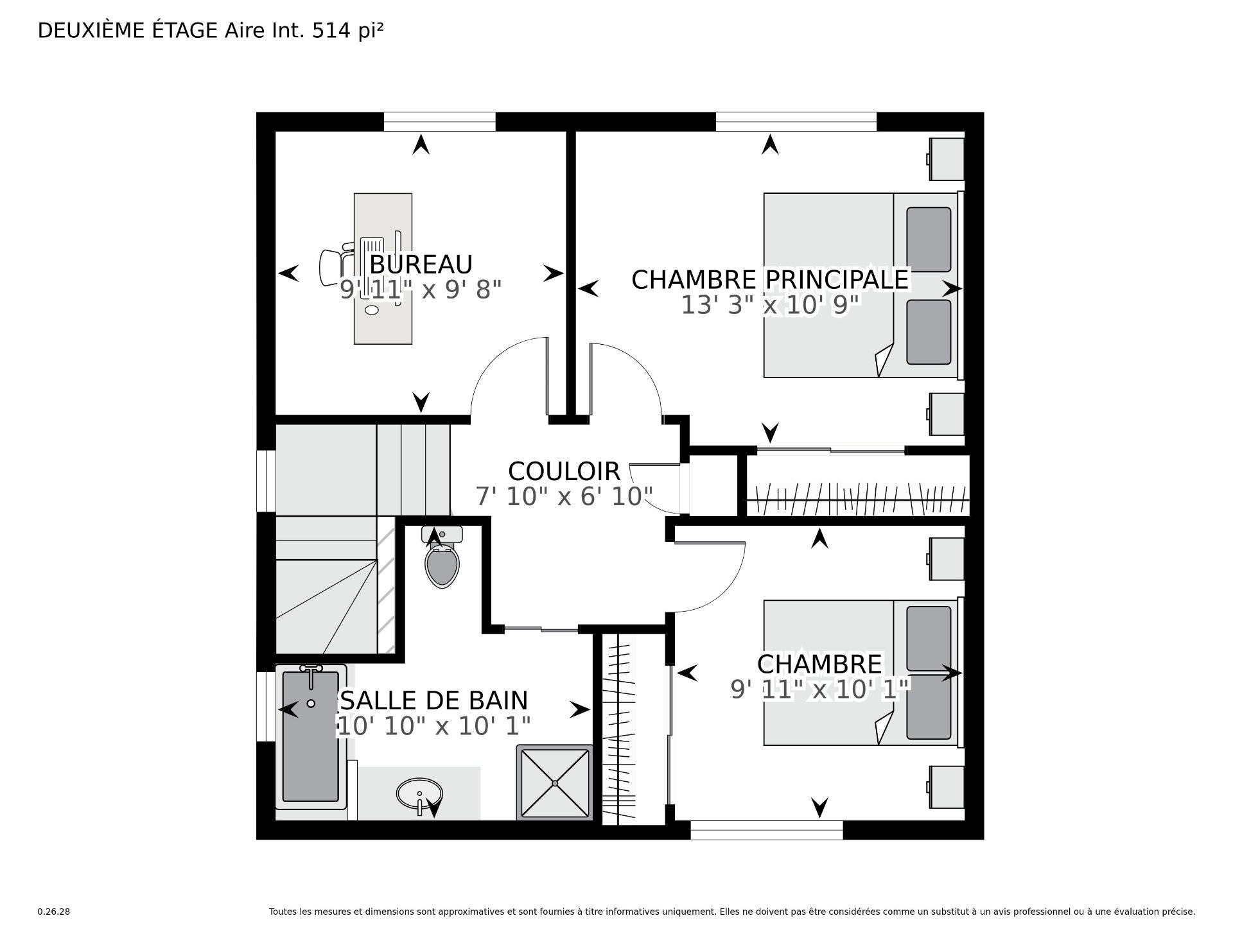 | Chambre à coucher | 9.11 x 10.1 P | 2ième étage | Bois |