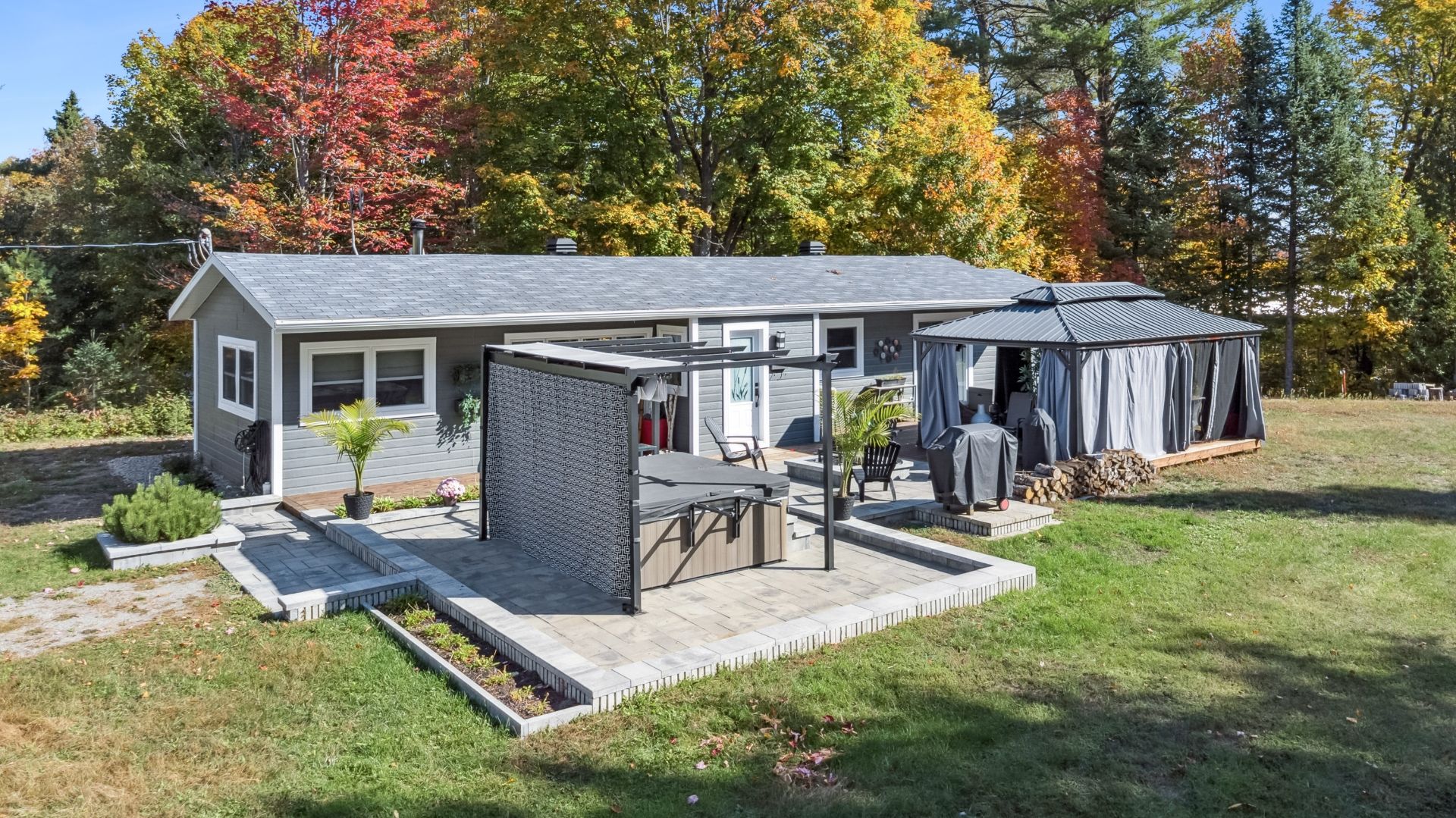 Inclus : Inclusion : (Chambre secondaire) Lit, table de chevet, tablettes. (Chambre des maitres) Lit, table de chevet,tapis,commode et chaise.(Salon) Meuble de télé, divan, boite à bois, tapis, 2 tables, article de foyer et lampe sur pied. (Cuisine) Table et chaise,cellier, étagère, décoration, laveuse/sècheuse et tablette. (Cabanon) Coupe bordure EGO, tondeuse TORO, génératrice,pelles,rateau, article de jardins, étagères et meuble en bois. Les meubles extérieurs.