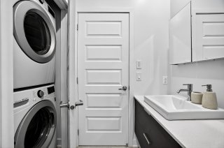 Inclus : Laveuse LG et sécheuse LG superposées, thermopompe murale, four GE, réfrigérateur GE, lave-vaisselle Blomberg, base de lit avec rangement glissant