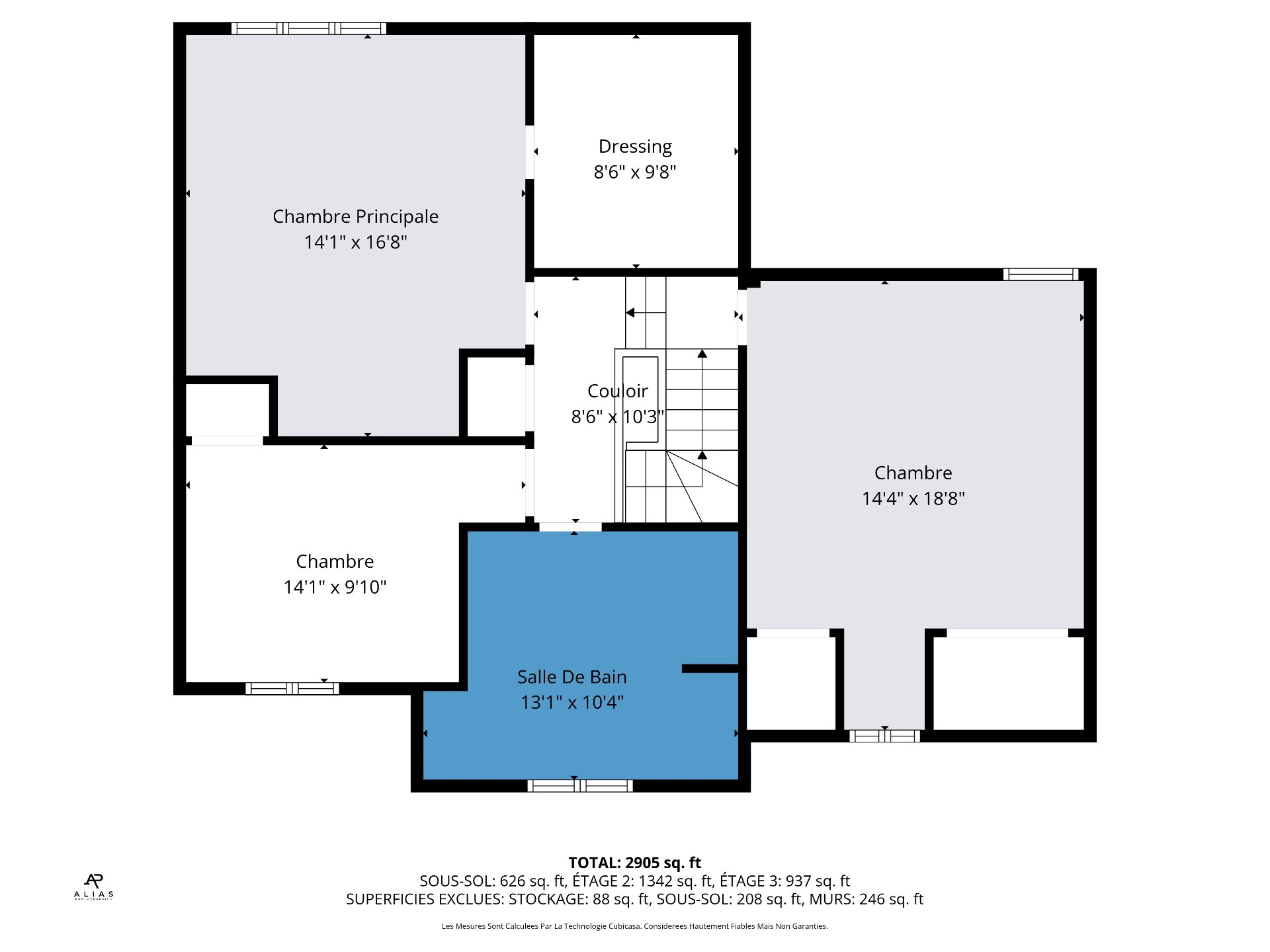 | Salle de bains | 13.1 x 10.4 P | 2ième étage | Céramique |